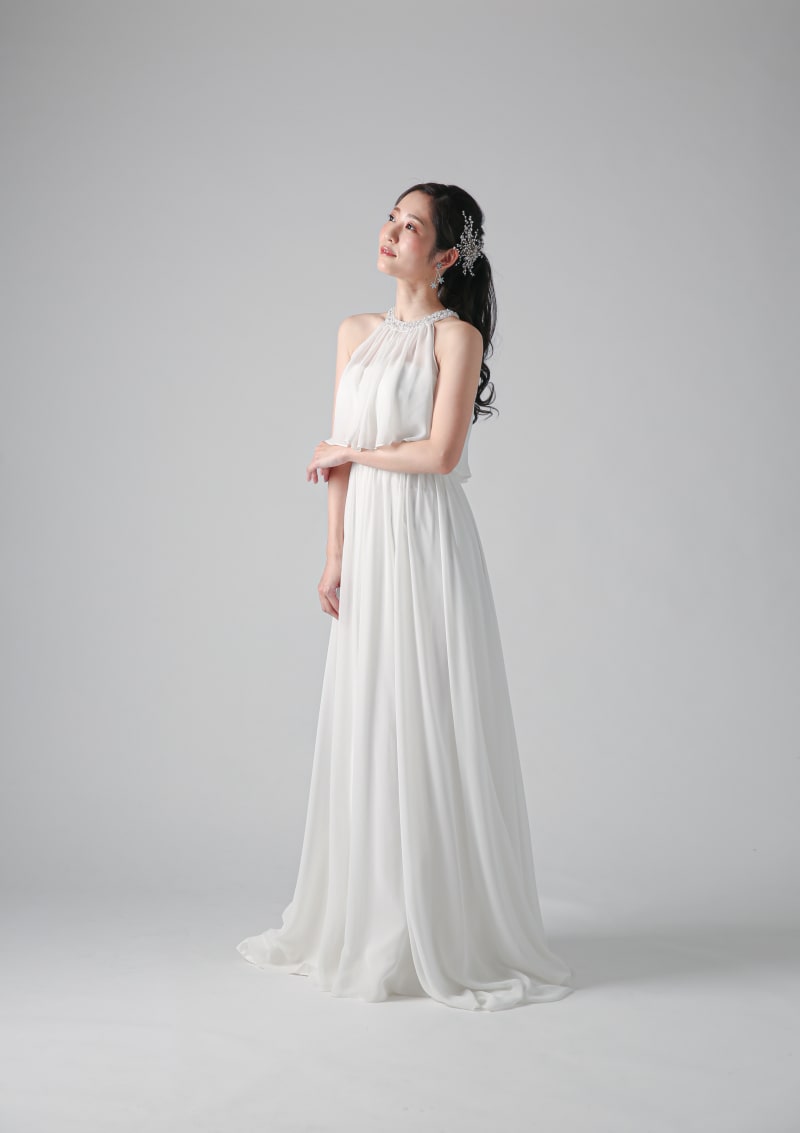 軽やかでとても動きやすいスイートなウエディングドレスは、緑があふれるガーデンでのフォトウエディングや、自然の風を感じるビーチでのフォトウエディングにおすすめの一着。