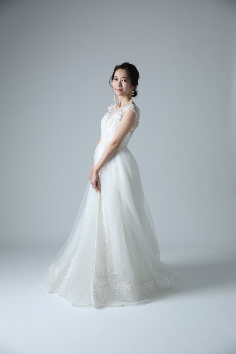 存在感のあるレースとビージングがドレス全体にあしらわれており、360度どんなシーンにも映える隙のない凛とした輝きを与えてくれる。