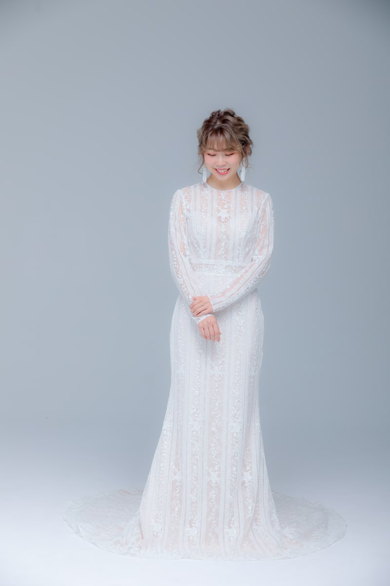 ソフトマーメイドラインで、女性らしいボディーラインをやわらかく演出。繊細すぎない柄の総レースが肌を上品にのぞかせることで、軽やかさを醸し出します。肌を見せることに抵抗のある花嫁さまにもおすすめの一着。肌の露出を抑えながらも、ボディラインを見せるデザインで、センシュアルな印象に仕立ててくれます。