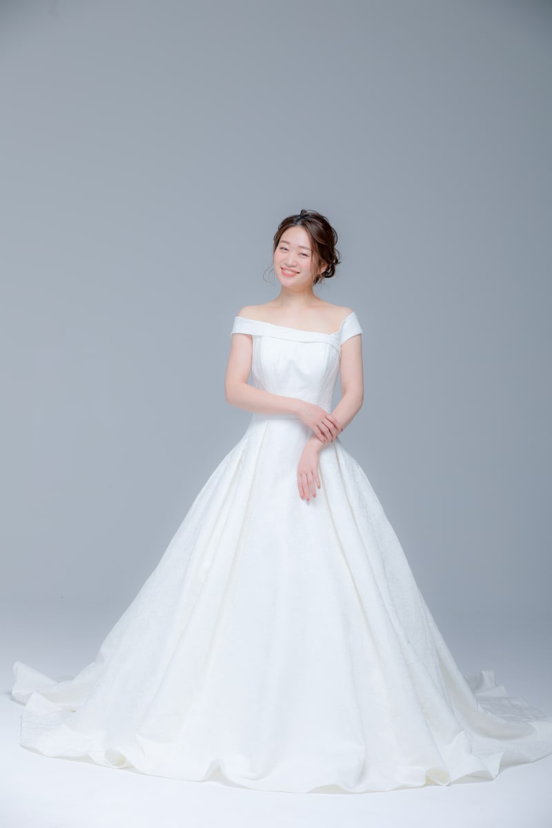デコルテを美しく見せてくれるカッティングとしっかりした素材感で二の腕もカバーするオフショルデザインです。