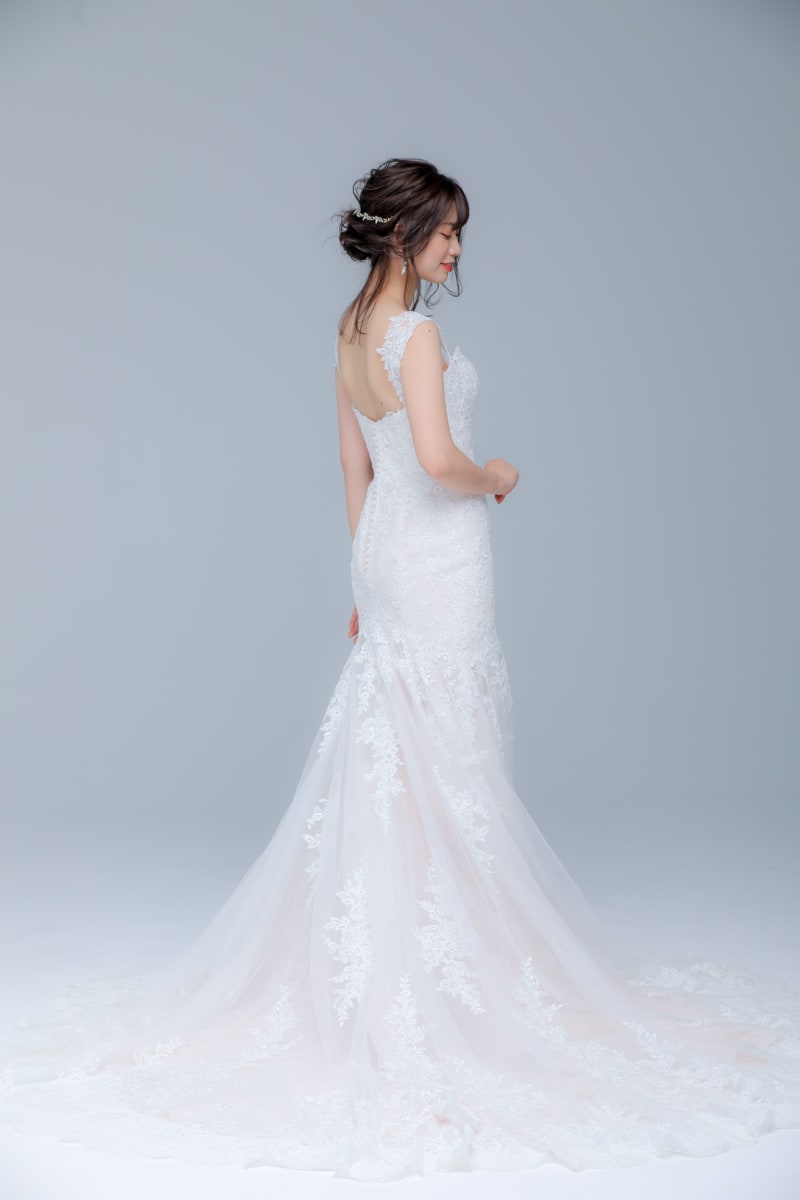 バックスタイルは露出は少なくトレーンも長めになっております。