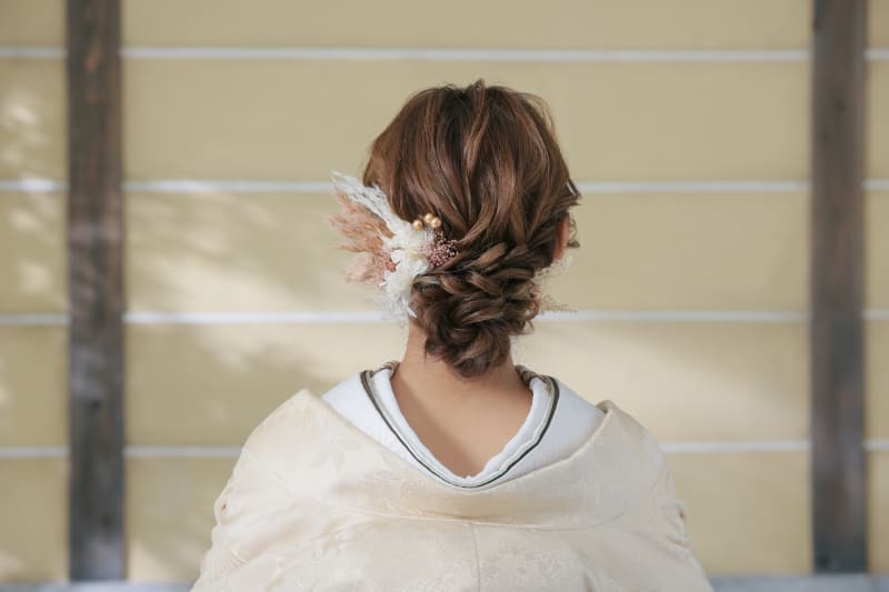 髪飾りは白無垢+可愛いイメージに合うように、白や淡い色のドライフラワーで柔らかさを出しました!