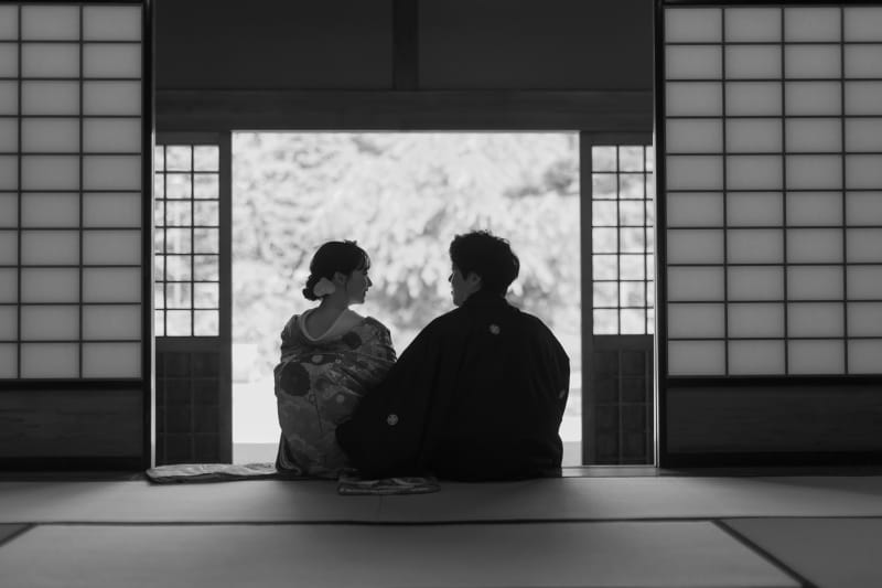 お次はモノクロでのショット!!カラーのお写真とはまた違った雰囲気で、着物の一つ一つの柄の繊細さがより映えるショットになってます!☆