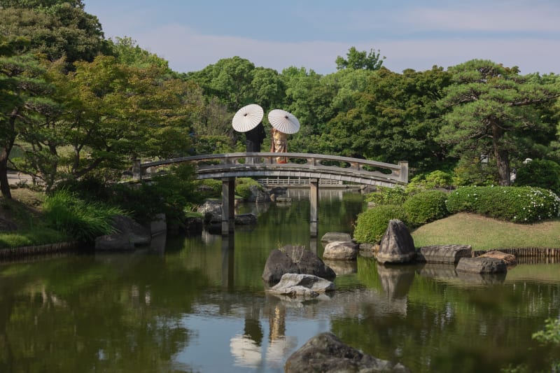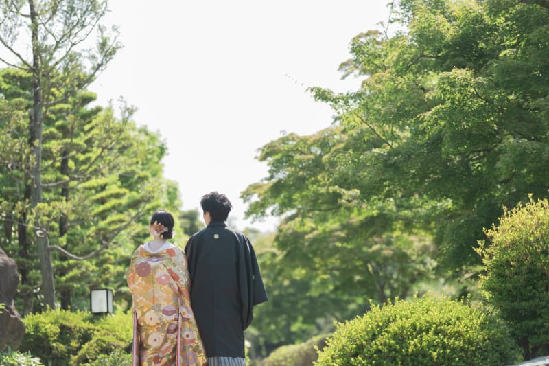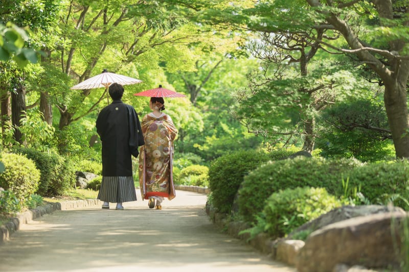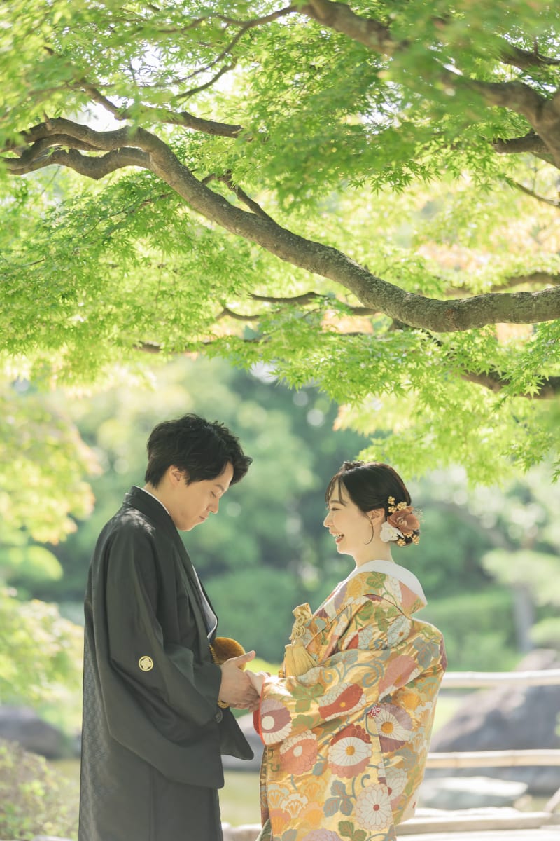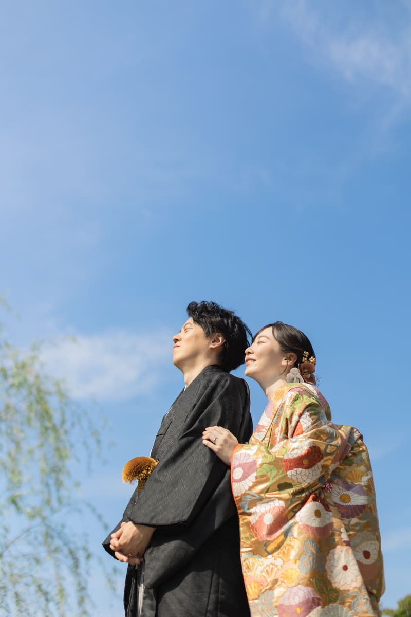 真っ青に広がる空に緑と新郎新婦のお二人。自然溢れる大仙公園での撮影は、和装衣装をより際立たせるスポットとなっております!