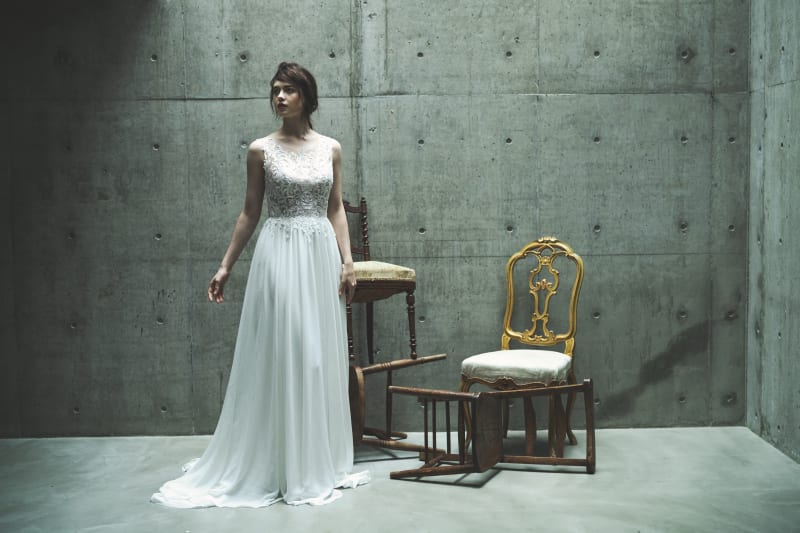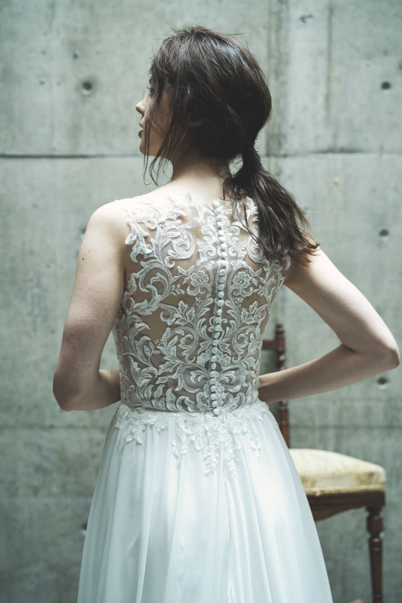 上半身には繊細なイリュージョンレースが施されており、ほどよい透け感が女性らしいクラシカルで上品な逸品です。ナチュラルなヘアメイクにフリンジのアクセサリーを合わせてボヘミアンテイストにまとめても素敵ですし、大人っぽいタイトなシニョンにラインストーンのヘッドコームを合わせてトラディショナルにまとめても◎です。