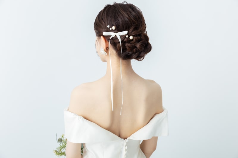 リボンのヘアアクセサリーとパールがご新婦様の雰囲気にとてもお似合いでした