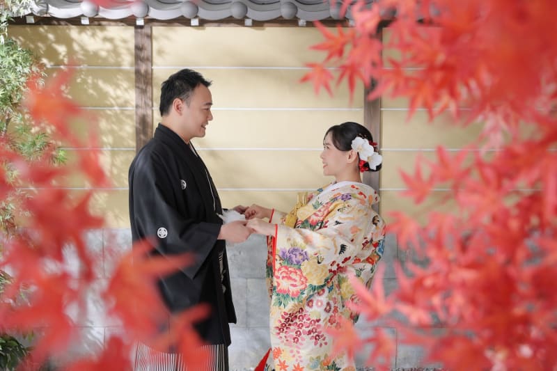 ご新婦様のソロショットは立ち姿で全身のお衣装がみえる一枚です。こちらも紅葉を少し入れて秋らしく。