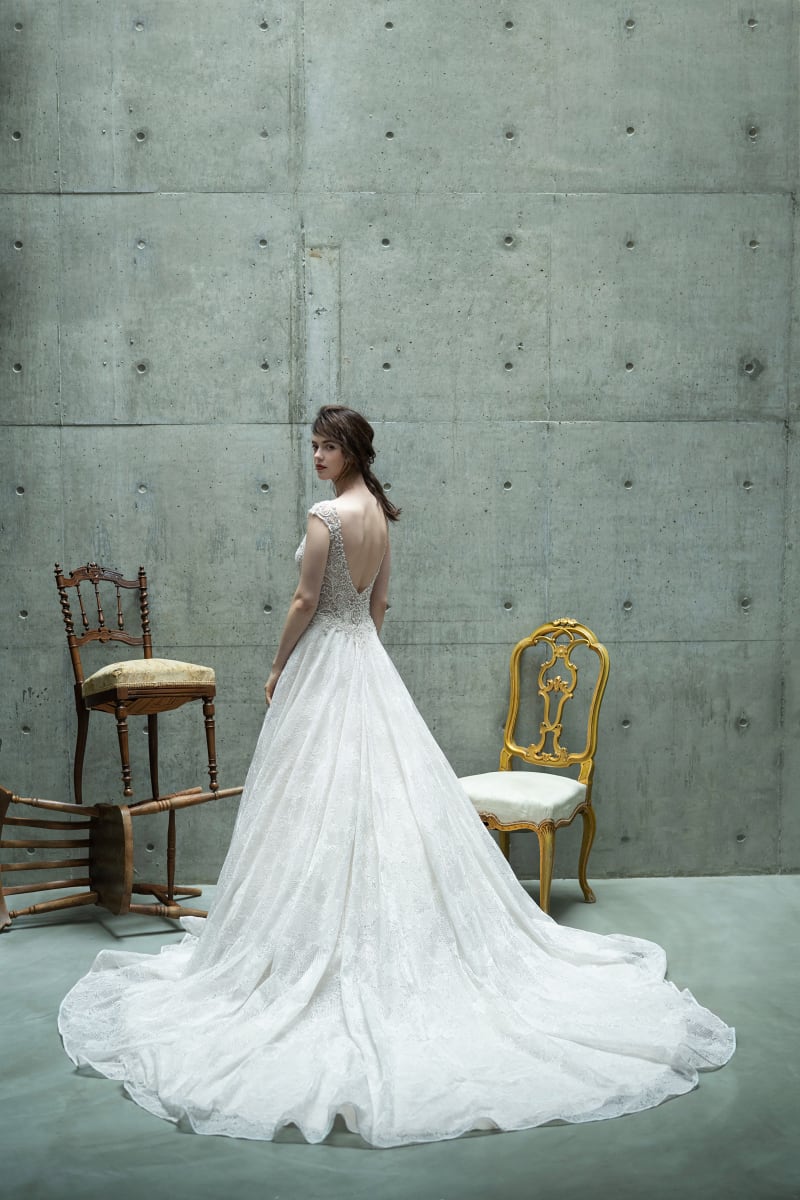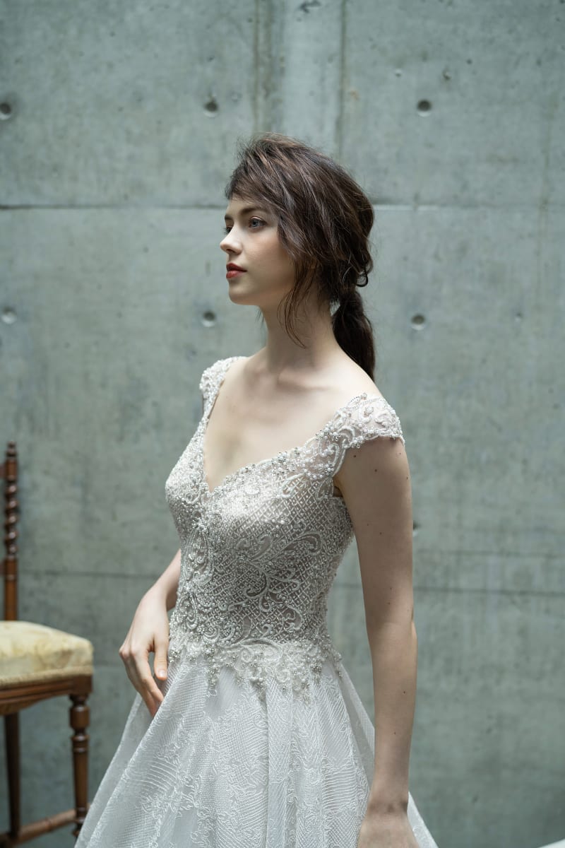 肩からデコルテにかけてのVネックラインは知的で気品さを感じさせ、大胆なバックスタイルとの絶妙なバランスが花嫁様の存在感をより一層際立たせてくれます。