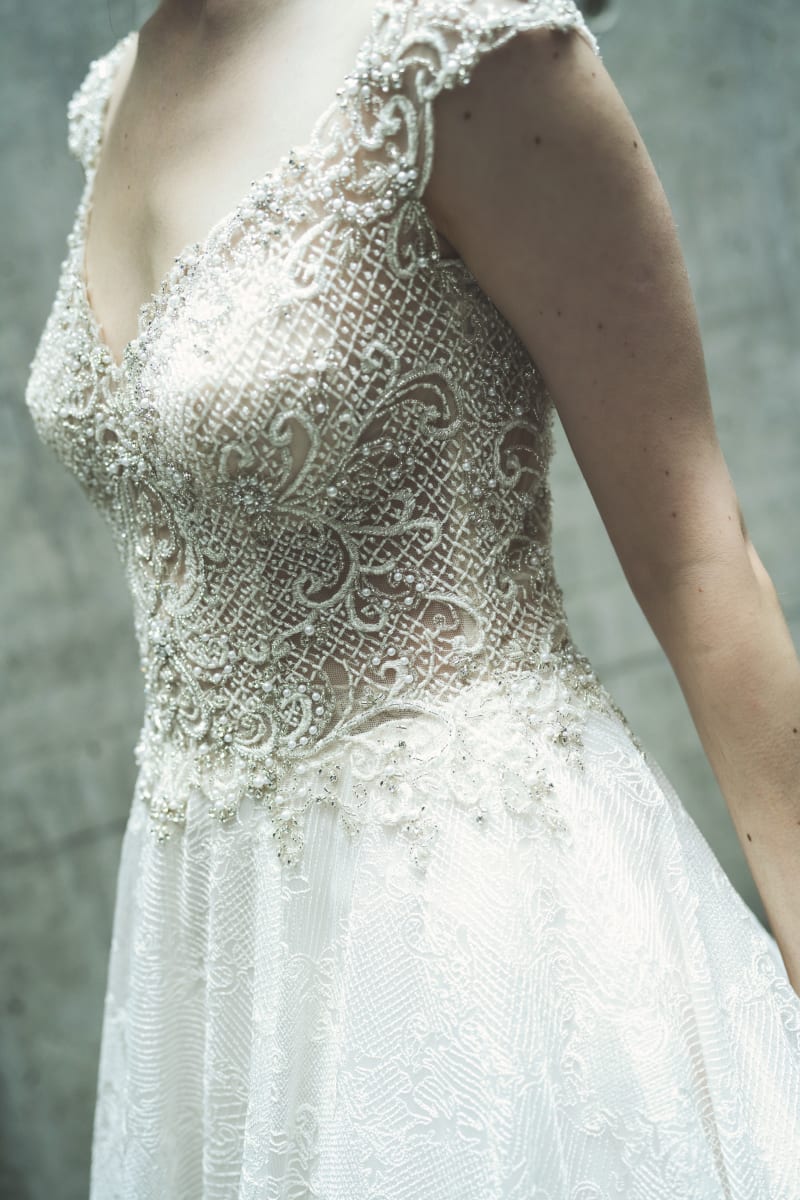 幾種ものパーツとシルバービーズが贅沢に施されたウエディングドレスは、繊細で上品な煌めきがなんとも美しいクラシカルな逸品です。