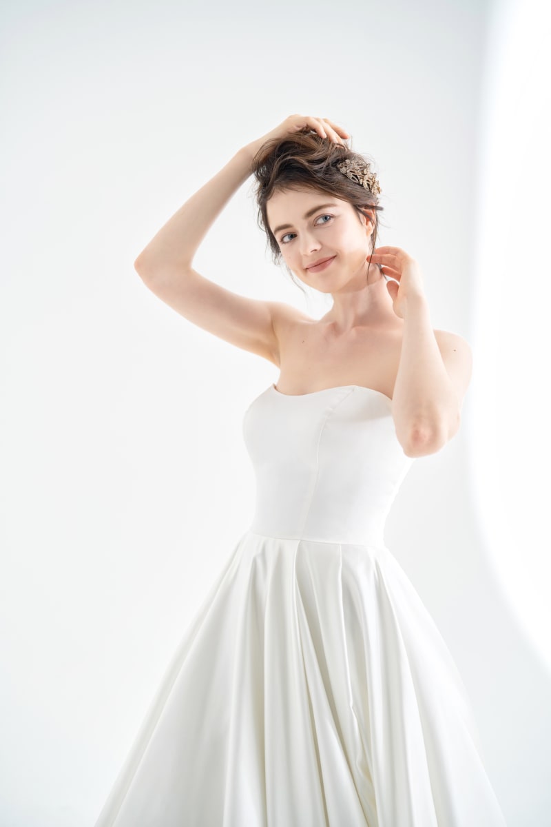 光沢感のあるサテンを使用 したトレンドのミニマルデザイン。 プリーツ仕様のスカートは充分な広がりを出しつつもウェストラインはすっきり見せる効果があります。 またスカート内にインパニエが内蔵されているので、使用するパニエによって広がりを調節できます。 全体的にシンプルなデザインですが、プリーツデザインが加わることで生地の質感と立体感を出し、 上品でクラシカルな印象を与えることができます。 更にスカートの立体裾フリルが軽やかさ演出しており、全体的に重くなりすぎないクラシカルデザインに仕上がりました。