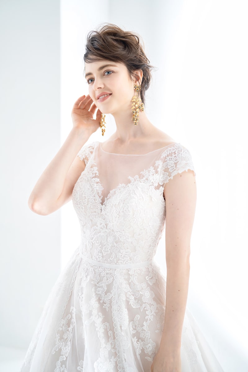スリーブから裾までたっぷりレースがあしらわれた、華やかな一着。背中を大胆に見せながら、Vネックで上半身をスッキリと見せられます。全体に散りばめられた小花のレースが、小柄な花嫁さんにも着やすいデザイン。ハイウエストの切り返しと裾にかけて広がっていくスカートのシルエットによって、スタイルアップ効果も期待できます。