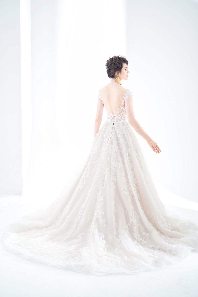 オープンバックスタイルで透け感のあるフレンチスリーブの新作ドレスです。裾元まで広がるレールはどの角度から見ても華やかで小柄な方にも着用して頂けます。スカート内部にはハードチュールが内蔵してあるため自然体で十分な広がりがあります。