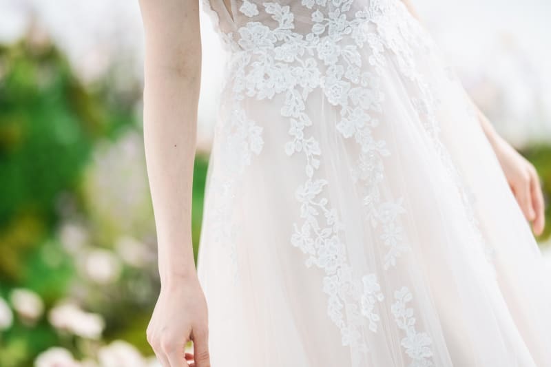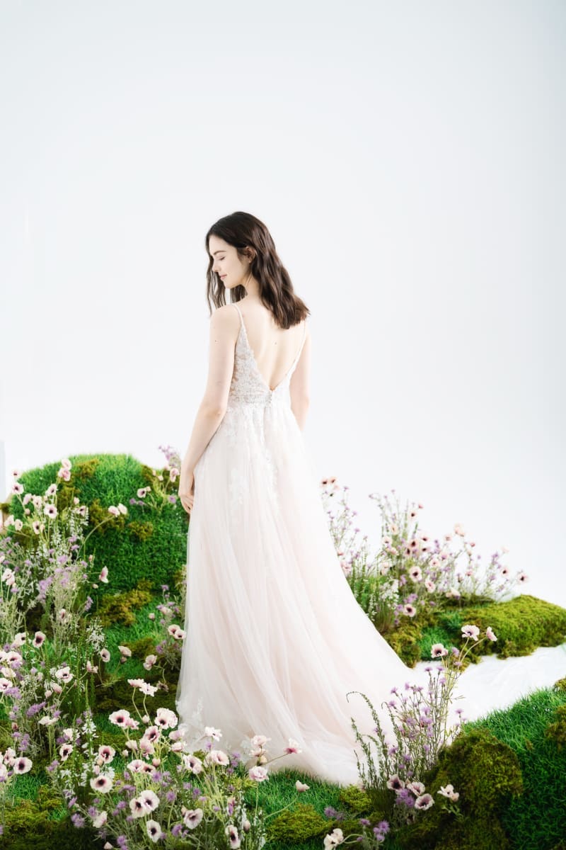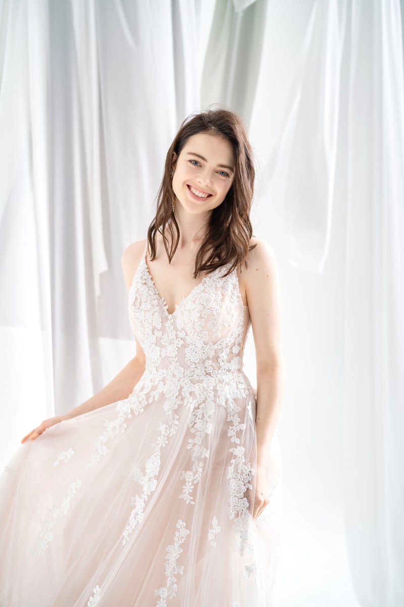 シャンパンピンクのニュアンスカラーとソフトチュールに施された花モチーフのケミカルレースがなんとも可愛らしい華やかなウエディングドレス。