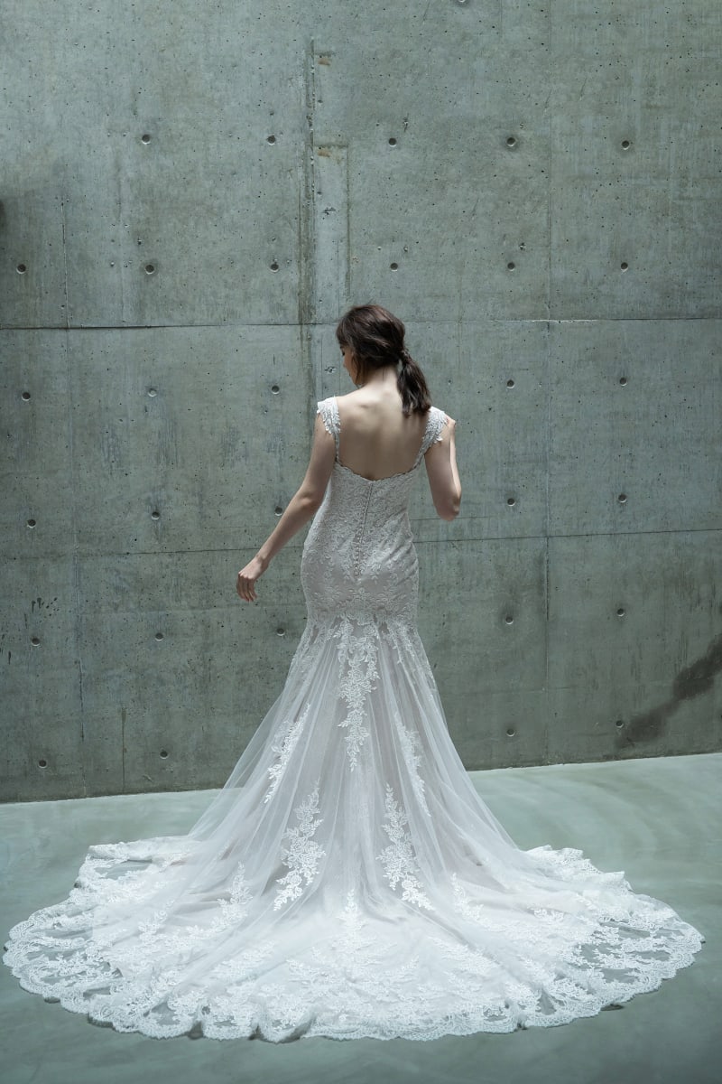 女性らしいボディコンシャスなラインが美しいマーメイドラインと華やかなバックスタイルが魅力的なウエディングドレス。