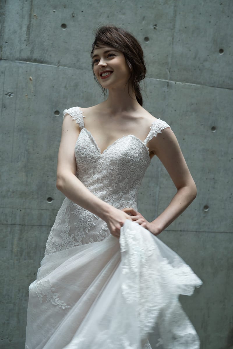 取り外しが可能な2WAYのショルダーでロケーションごとにガラリと雰囲気を変えるのも◎。そして、バックスタイルも印象的なこちらのウエディングドレスは、ステンドグラスが美しい大聖堂や都会的な街並みなど、さまざまなロケーションでのフォトウエディングにおすすめの一着です。