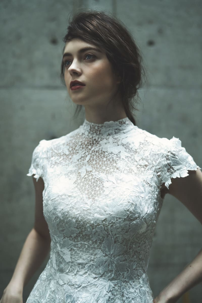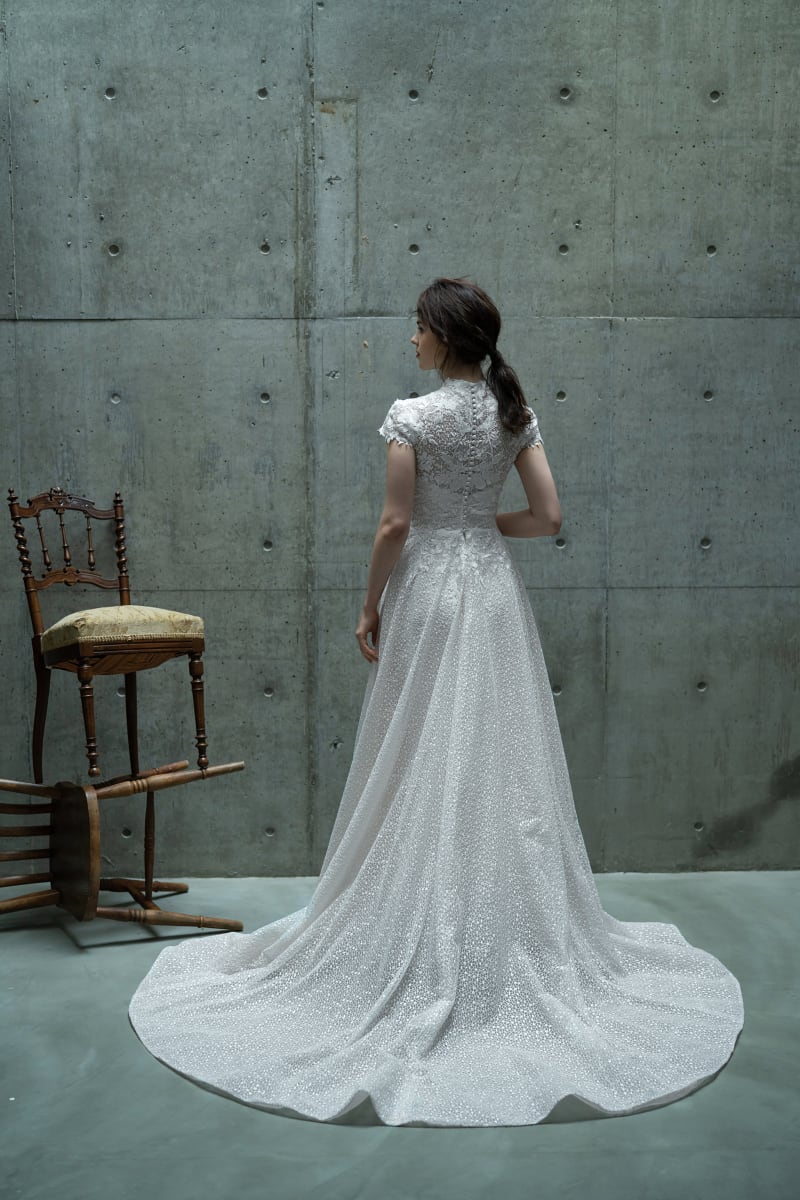 肩からデコルテにかけてのハイネックラインは知的で気品さを感じさせ、さらにはくるみボタンが施された上品なバックスタイルが花嫁様の存在感をより一層クラシカルな印象に際立たせてくれます。