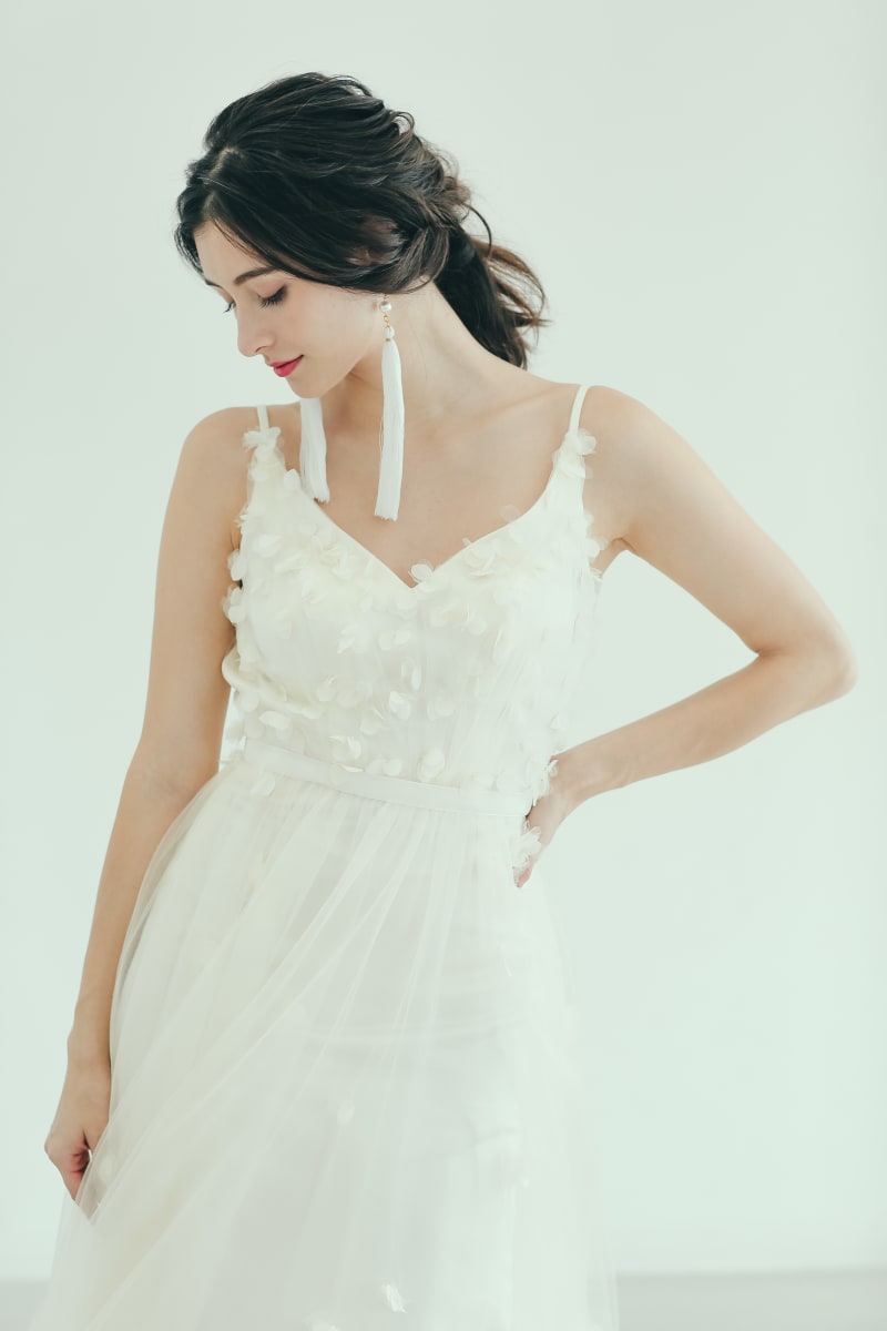 柔らかいチュールのスカートは軽やかで着心地もよく、また、花嫁様の動きに合わせて優しく風をふくみ豊かに表情が変わるので、さまざまなシーンで活躍してくれます。