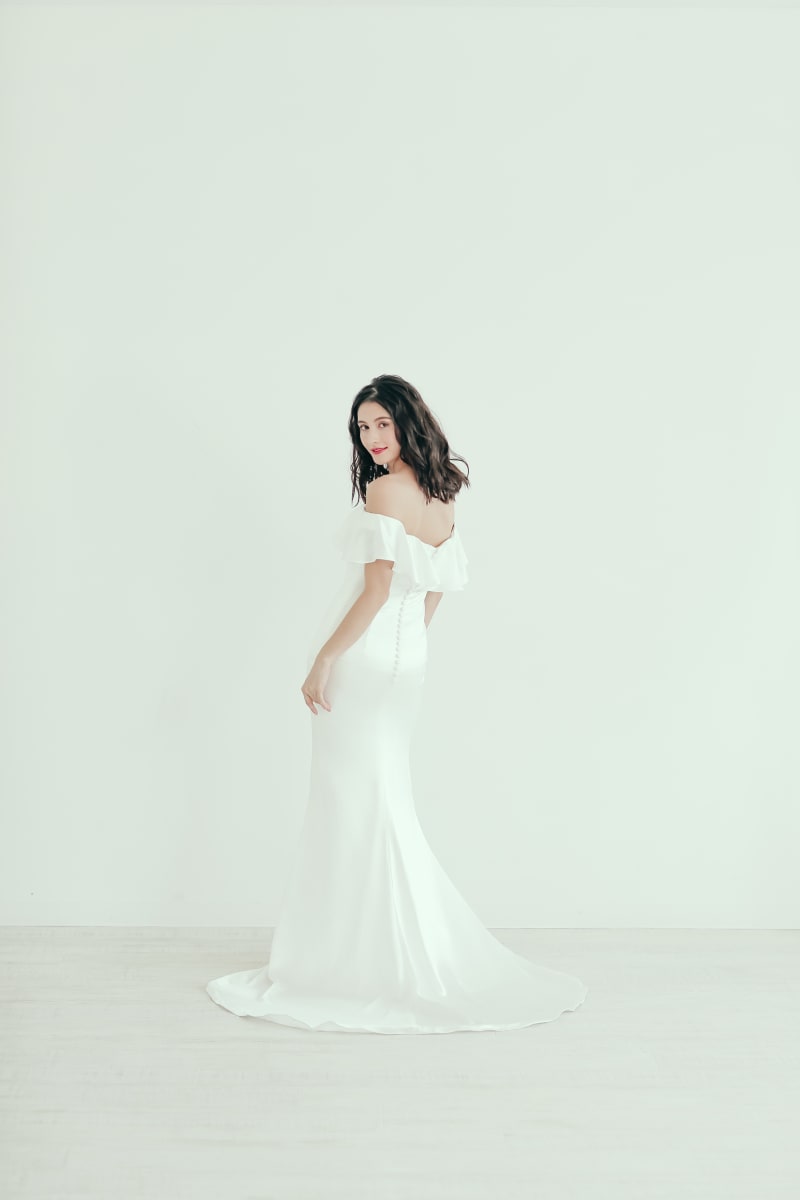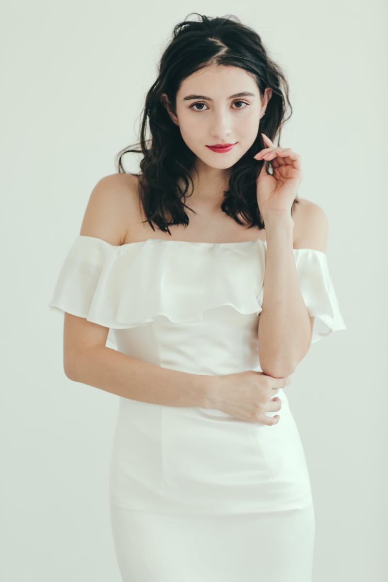 華奢な印象を与えてくれる幅広なフリルのオフショルダーは、上半身に優しい印象を与え、花嫁様の表情をより豊かに表現してくれます。光沢のあるマテリアルが高級感を演出し、シンプルな中にも優しい表情を魅せてくれる大人ロマンティックな逸品です。