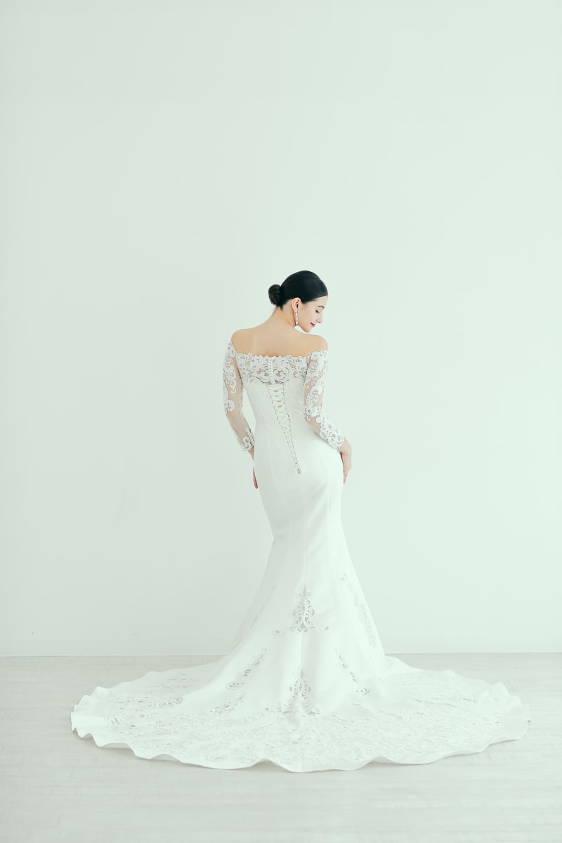 女性らしいマーメイドラインから流れる壮麗なロングトレーンも、サテンの質感でより一層ラグジュアリーな印象を与えてくれます。