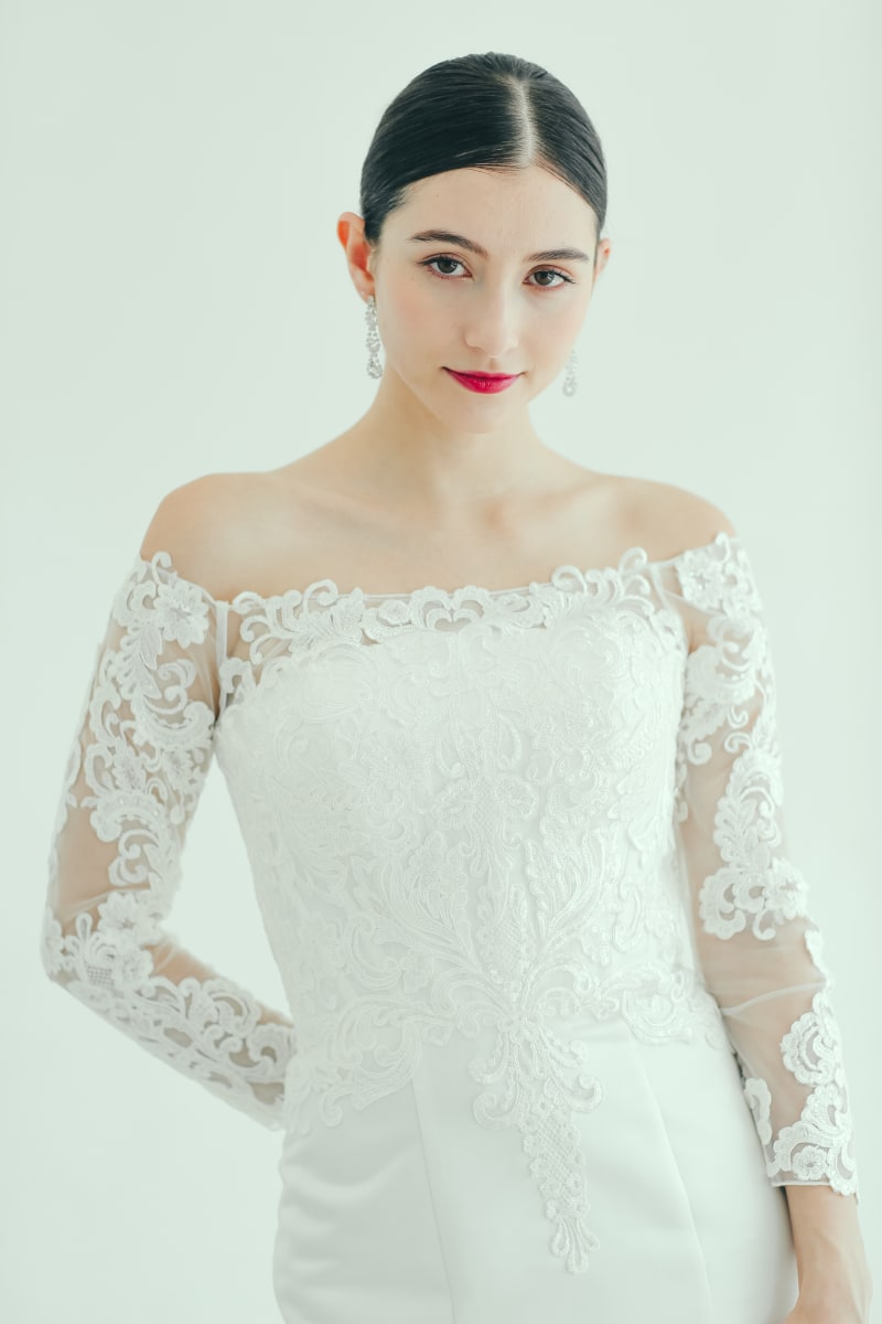 大胆な大柄のレースも華奢なオフショルダーのほどよい抜け感により重くなりすぎず、絶妙なコントラストで花嫁様の表情を華やかに演出してくれます。