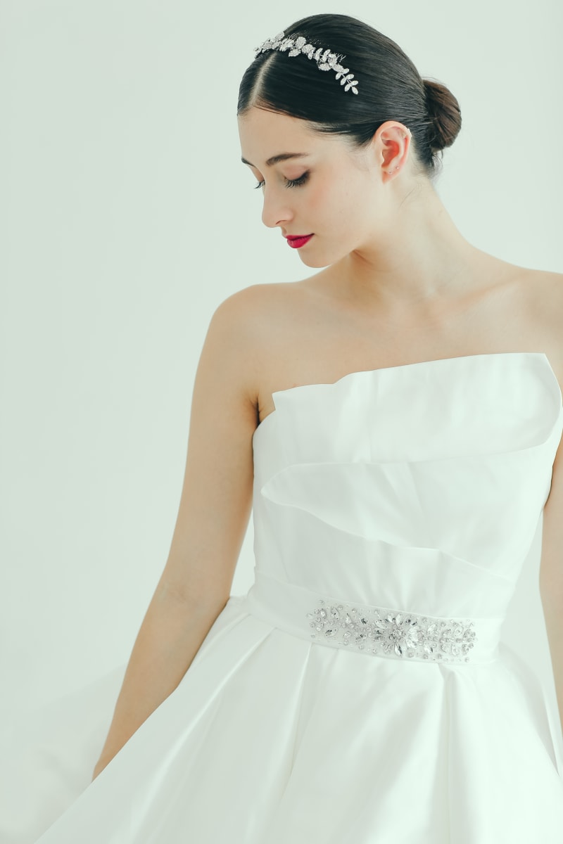 ハリのあるマテリアルで、ドレスのフォルムがしっかりと写真に残るウエディングドレスは、歴史のある建造物やクラシカルな教会など、重厚感あふれるロケーションにも負けない一着です。ぜひフォトジェニックな一枚を残してくださいね。