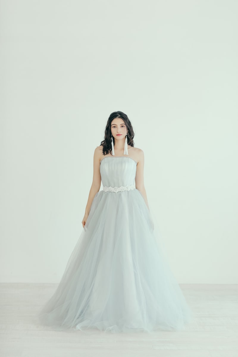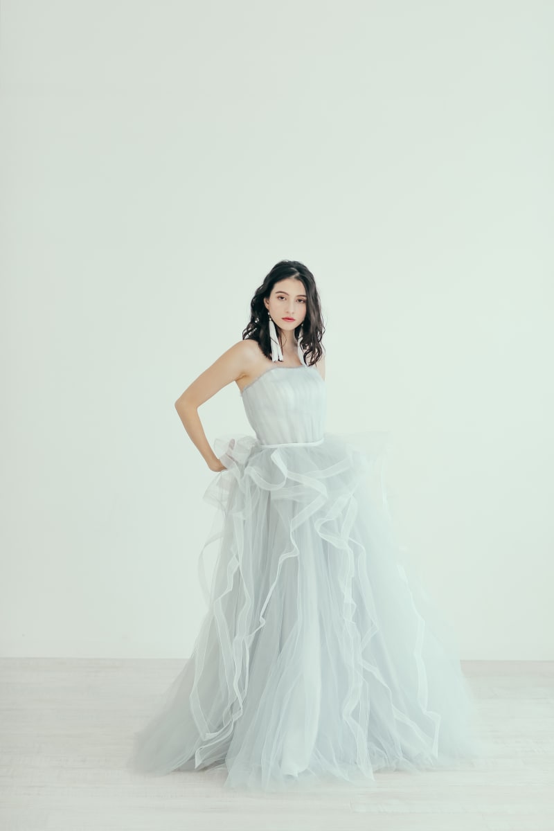 スモーキーブルーのニュアンスカラーは、シックで落ち着いた印象を与える大人カラーのドレスです。