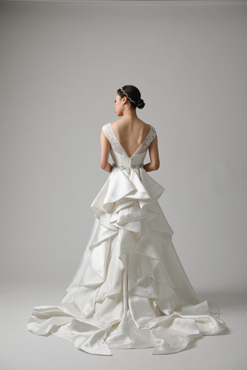 ステンドグラスが美しく映える教会や、歴史的建造物が立ち並ぶ街並みなどクラシカルなロケーションにおすすめの一着です。