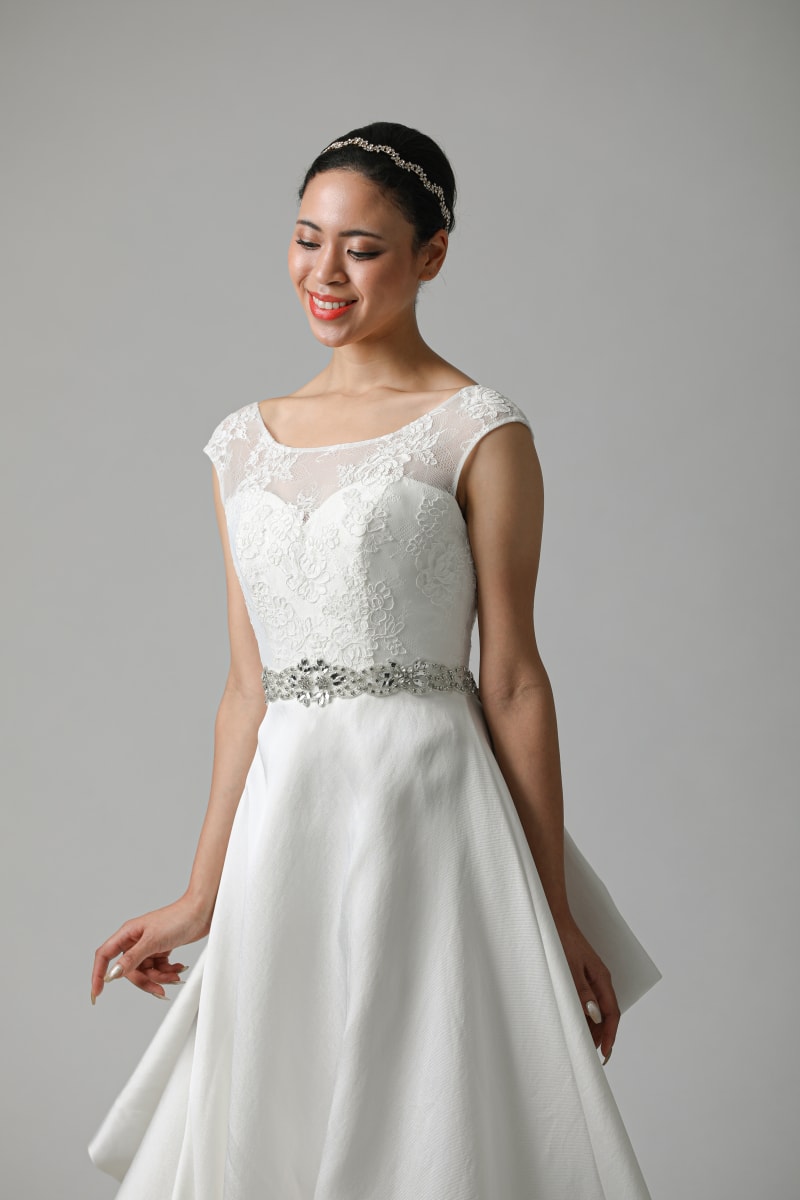 上半身には華奢なレースが施され、ほどよい透け感のフレンチスリーブが大人ナチュラルな優しい印象を与えてくれます。