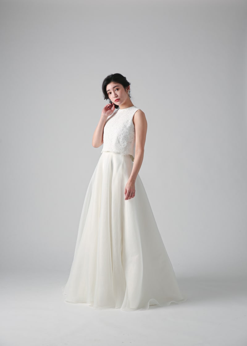 本日ご紹介のウエディングドレスは、カジュアルな印象の中にも洗練された雰囲気を持つ大人ノーブルなセパレートのウエディングドレスです。