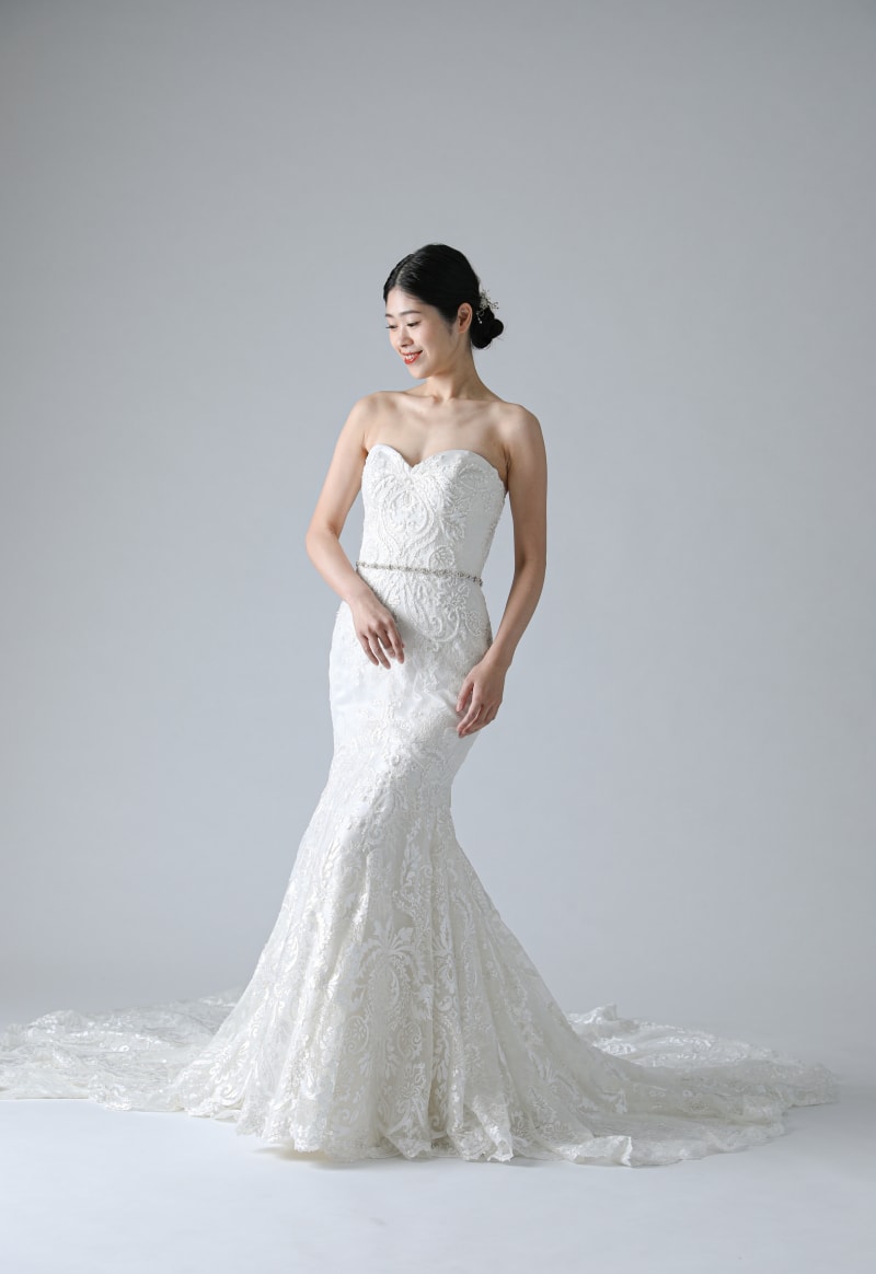 本日ご紹介のウエディングドレスは、気品あふれるフランスレースで仕立てられたマーメイドドレスです。