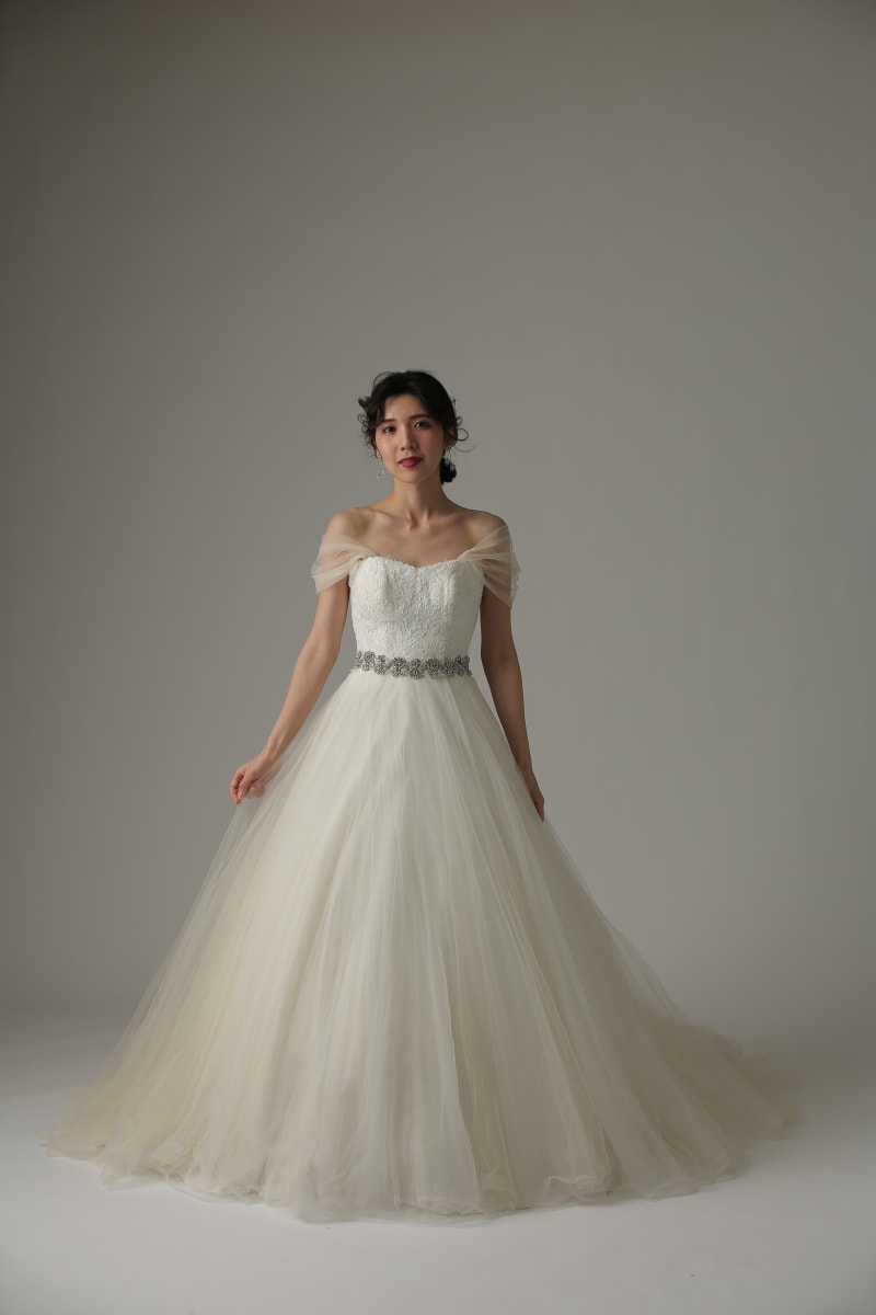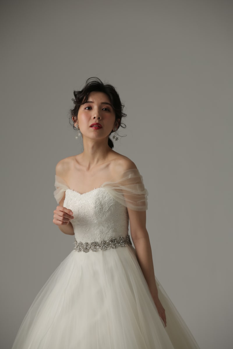 人気の王道スタイルに取り外し可能なチュールのショルダーを合わせ、スィートで可憐な印象をプラスしていろいろな表情を楽しむことができる一着です。