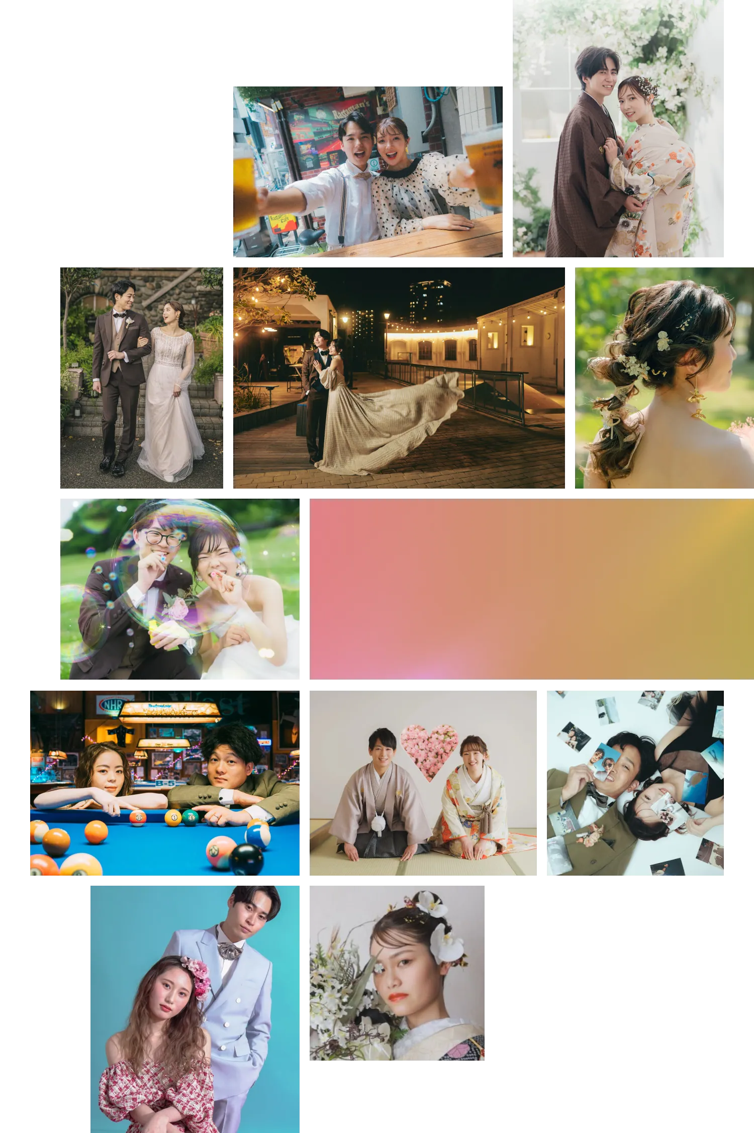 厳しい社内基準をクリアした、実力派フォトグラファーが担当。全国のリゾートから、思い出の街角まで。光や環境のすべてを計算し尽くし、どこにいてもドラマチックな一枚を創り上げます。