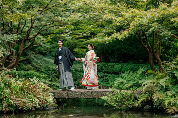 都内屈指の格式を誇る「つきじ治作」の広大な庭園でのロケーション撮影と、柔らかな自然光に包まれるハウススタジオを組み合わせた人気プラン。