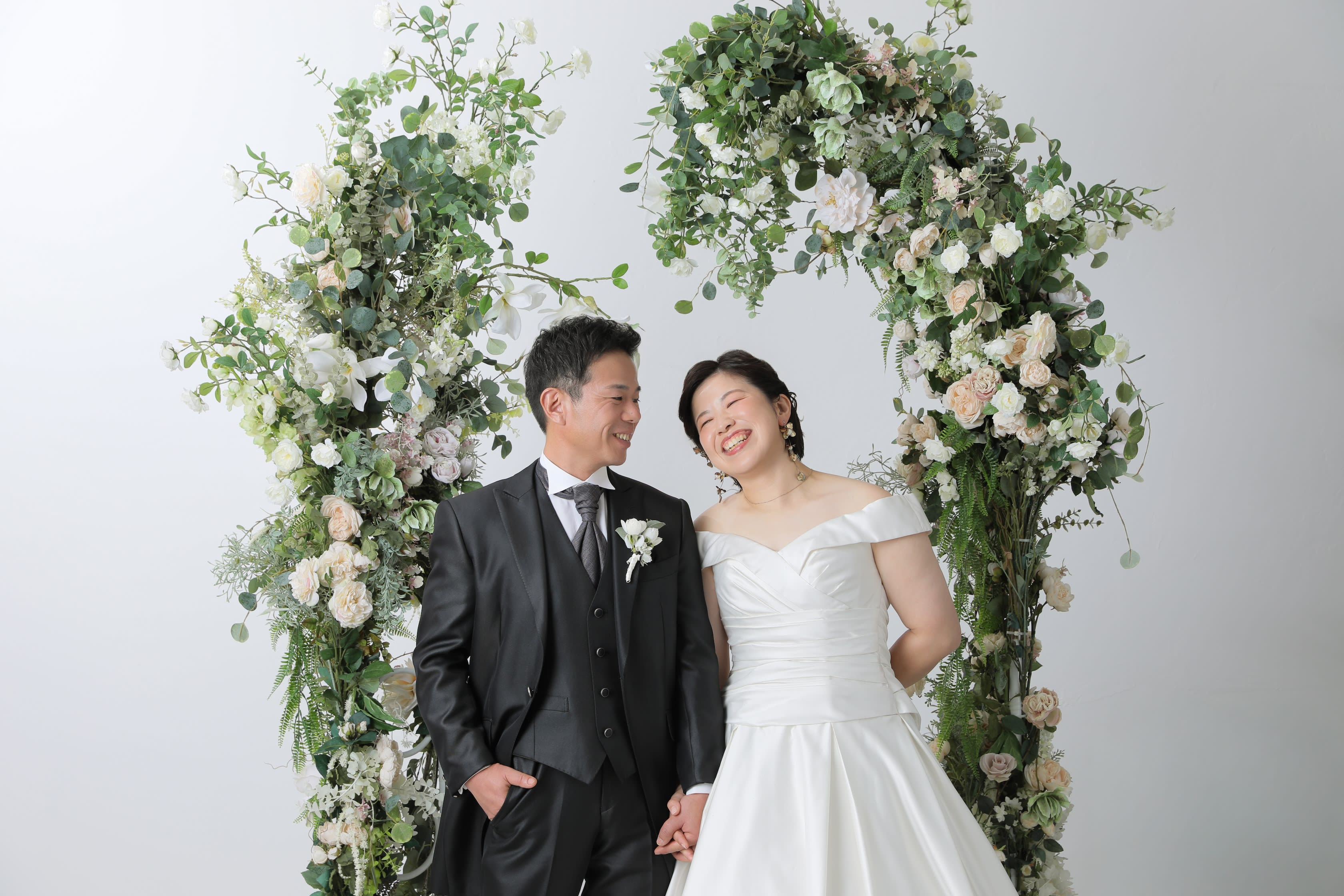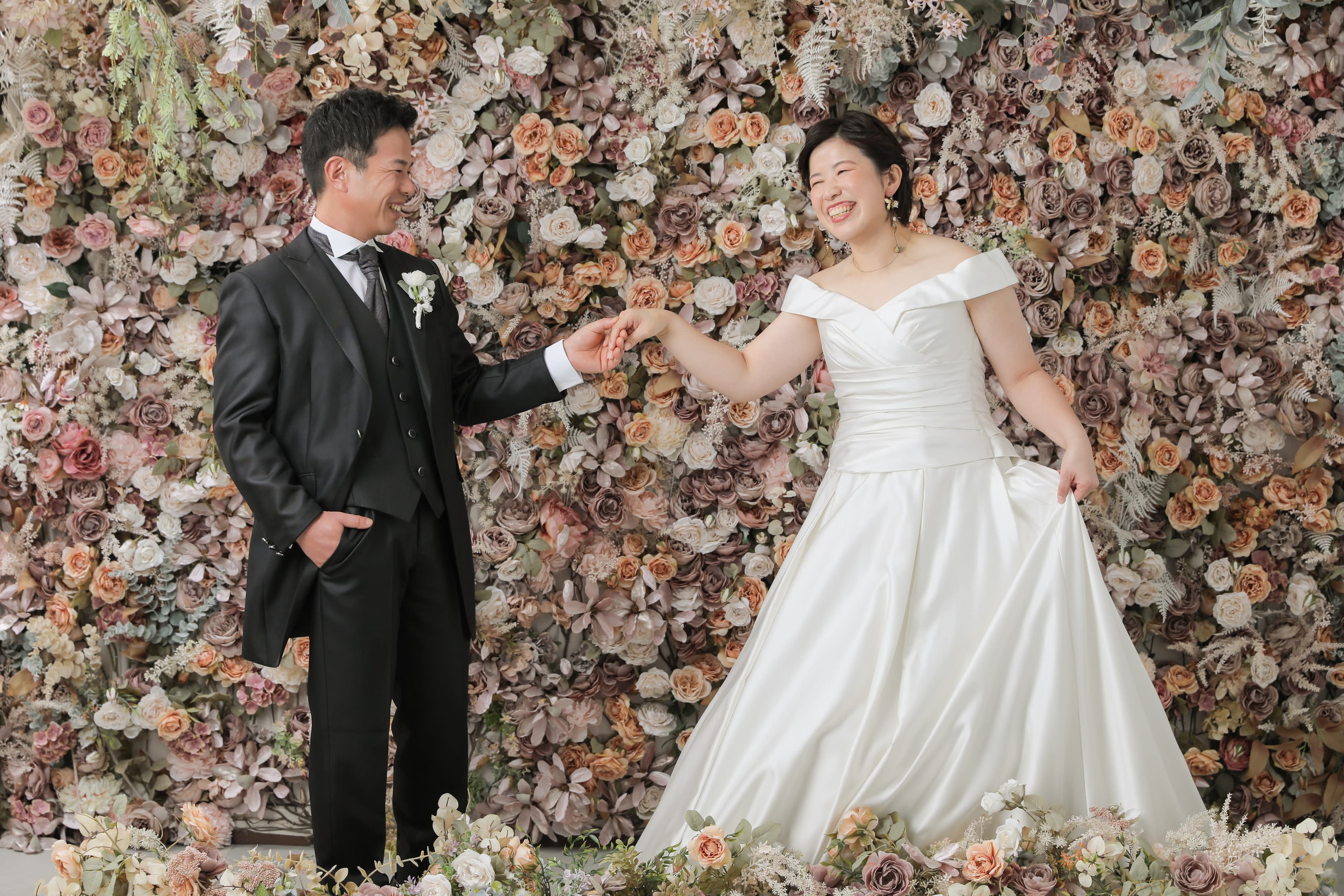 一面お花の壁が登場! 洋館風の立川店スタジオで撮影する洋装ウェディングフォトプラン