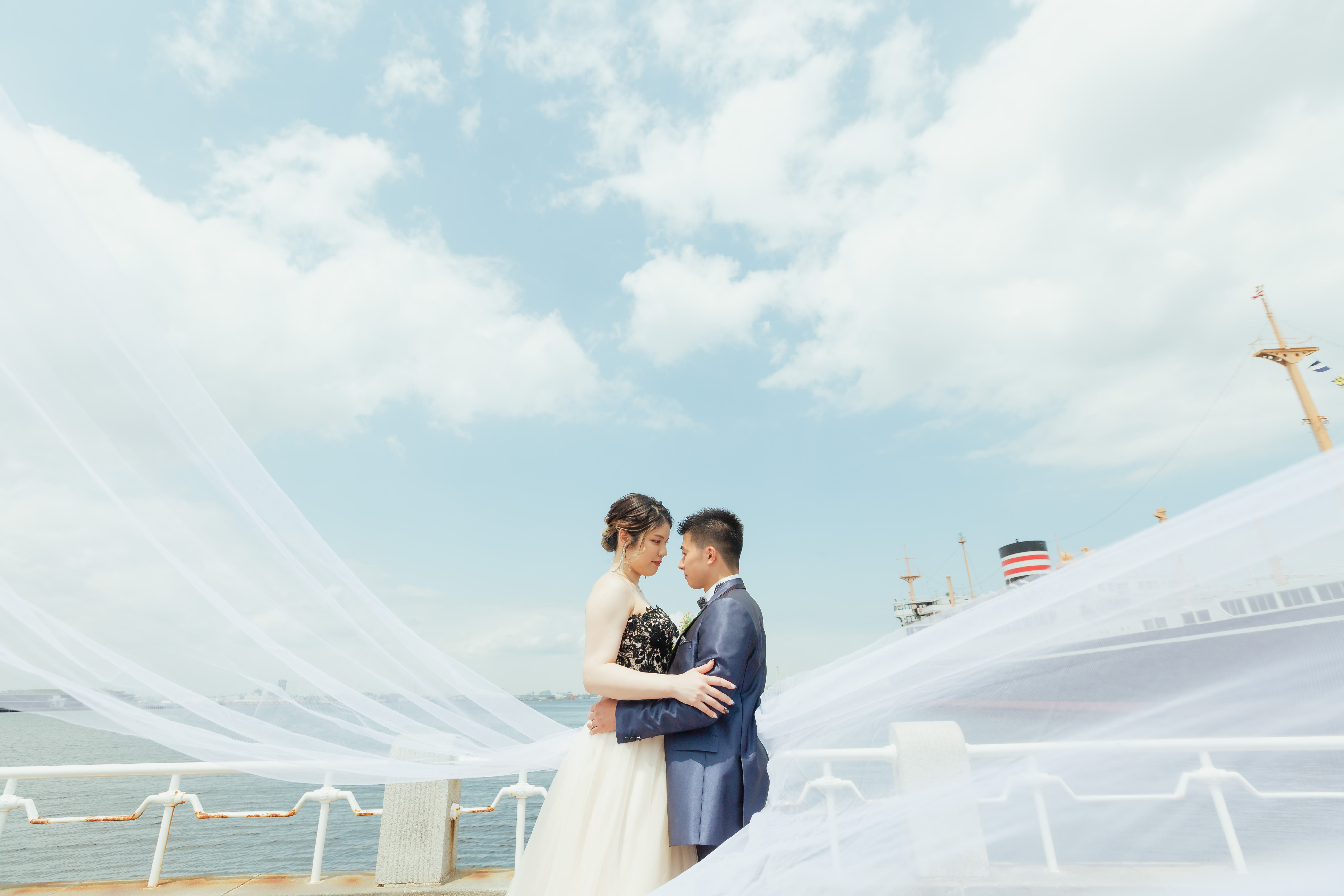 【横浜で記念日】汽笛が二人のスタートを祝う横浜のロケーションで美しい一枚を