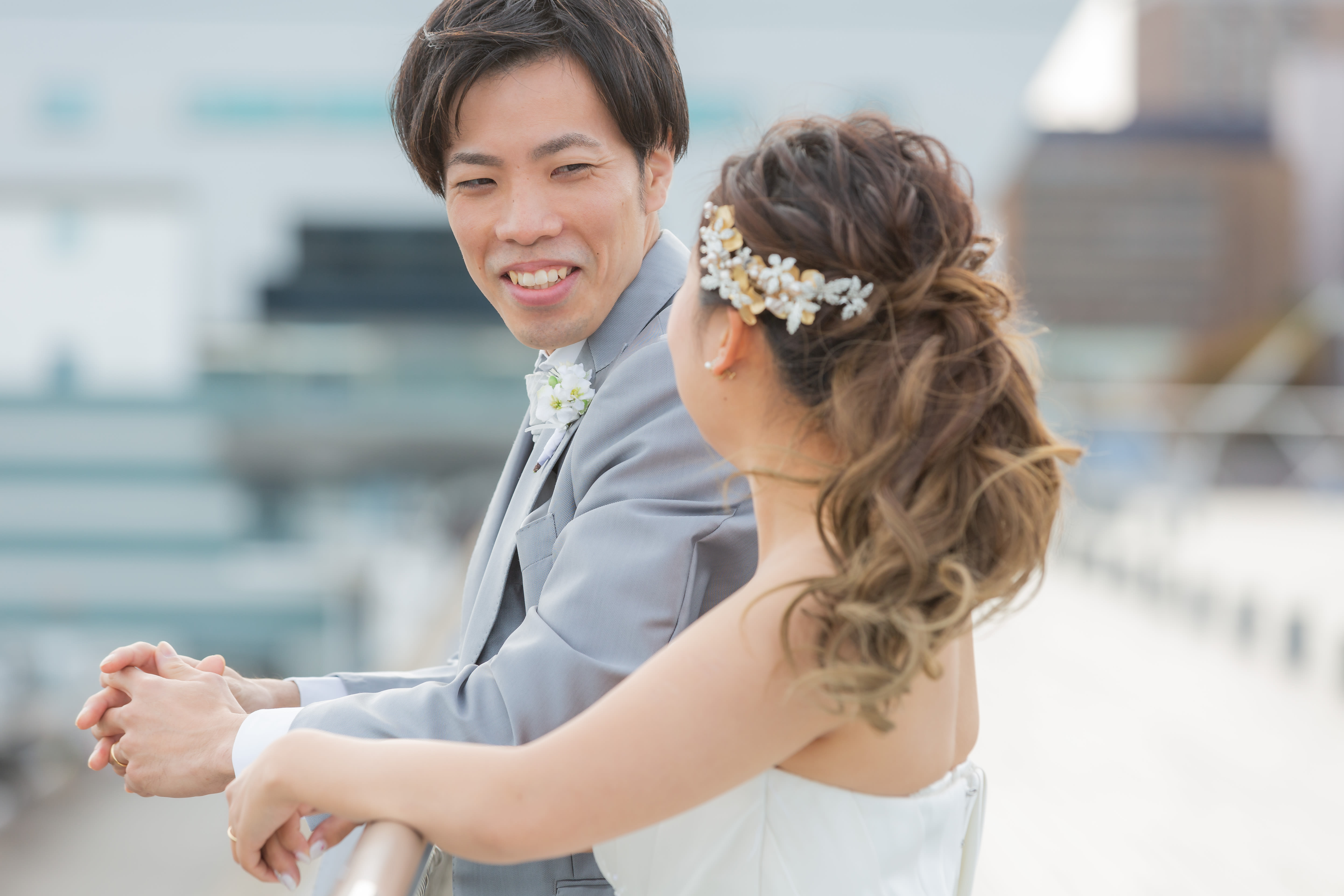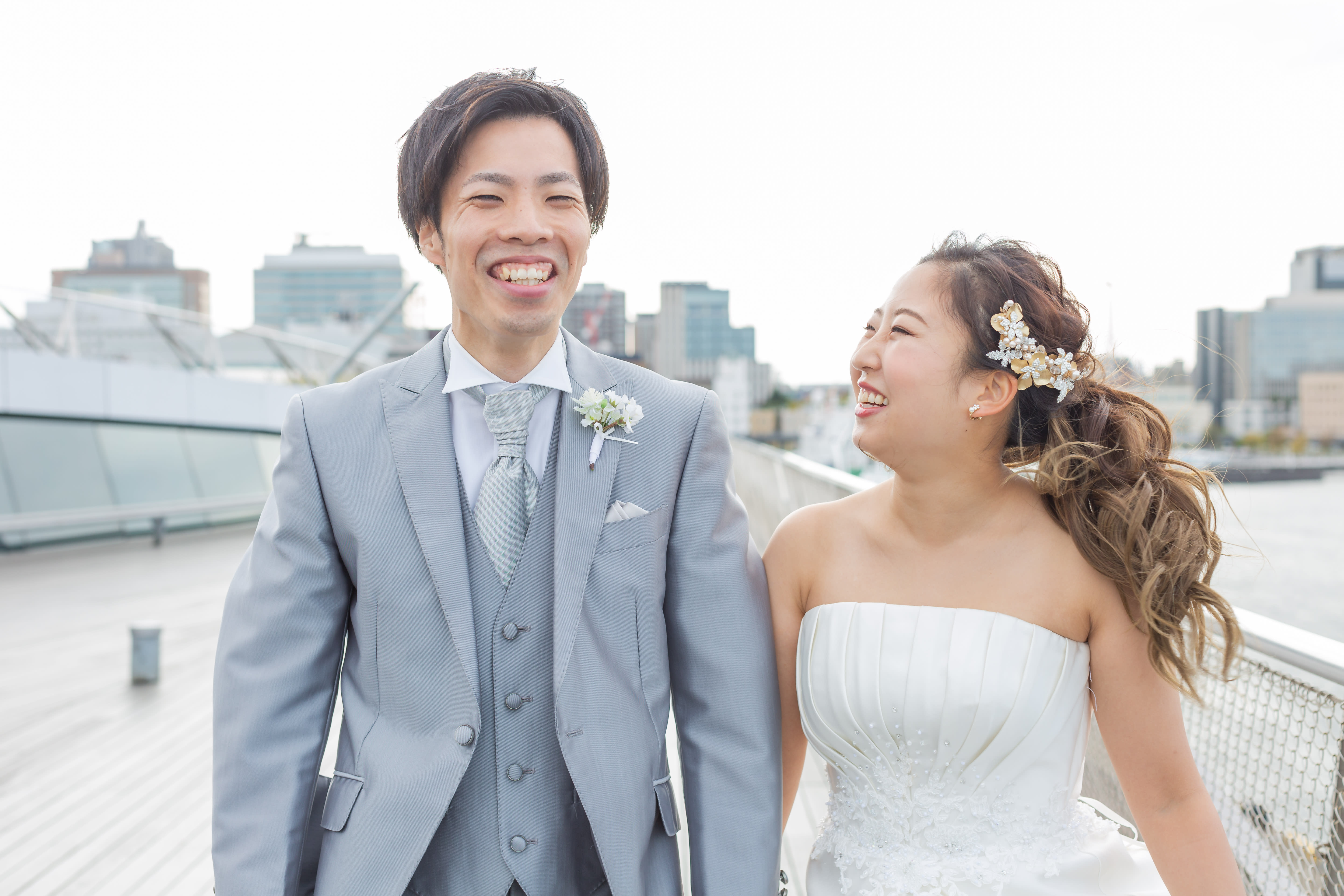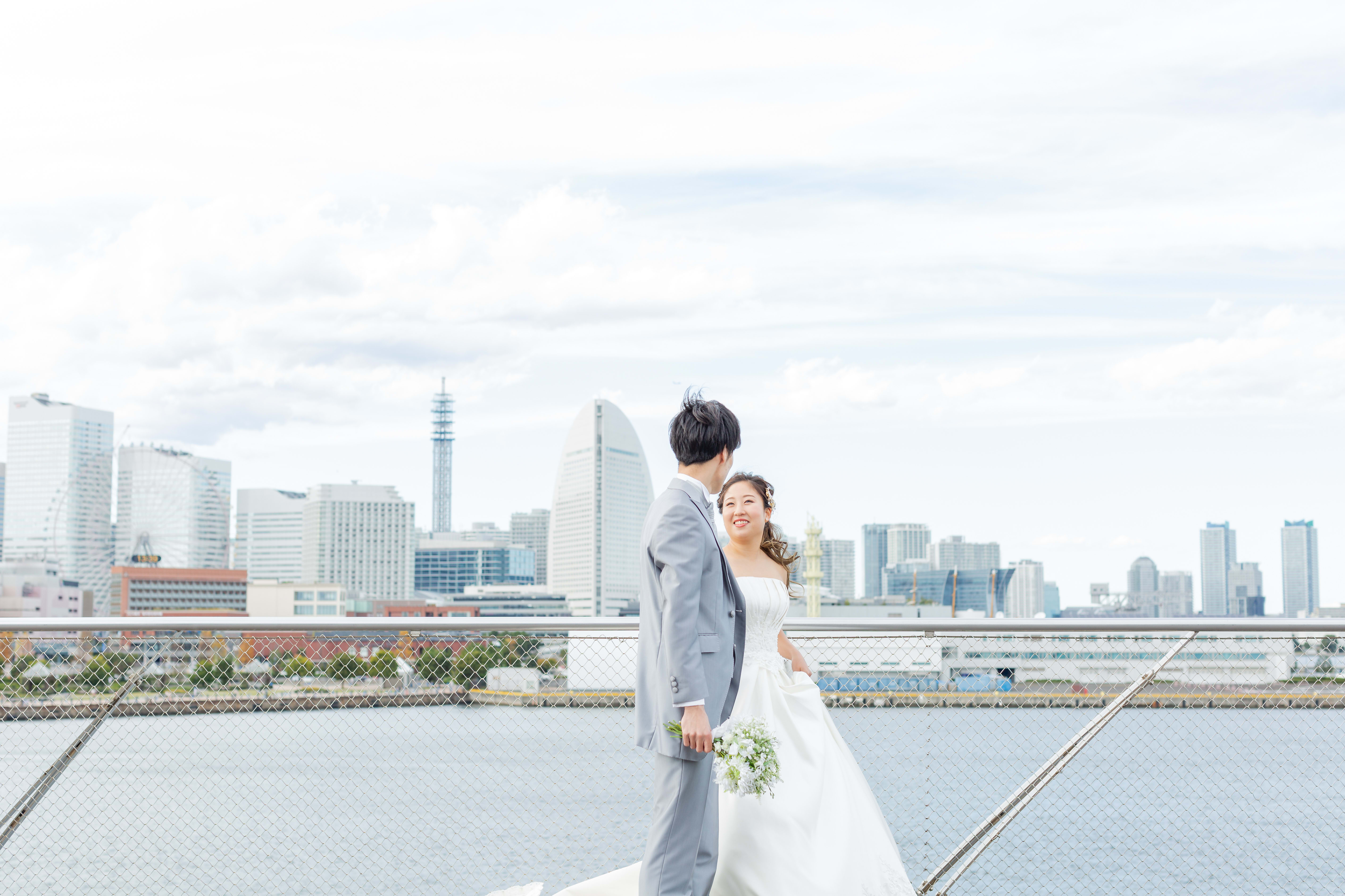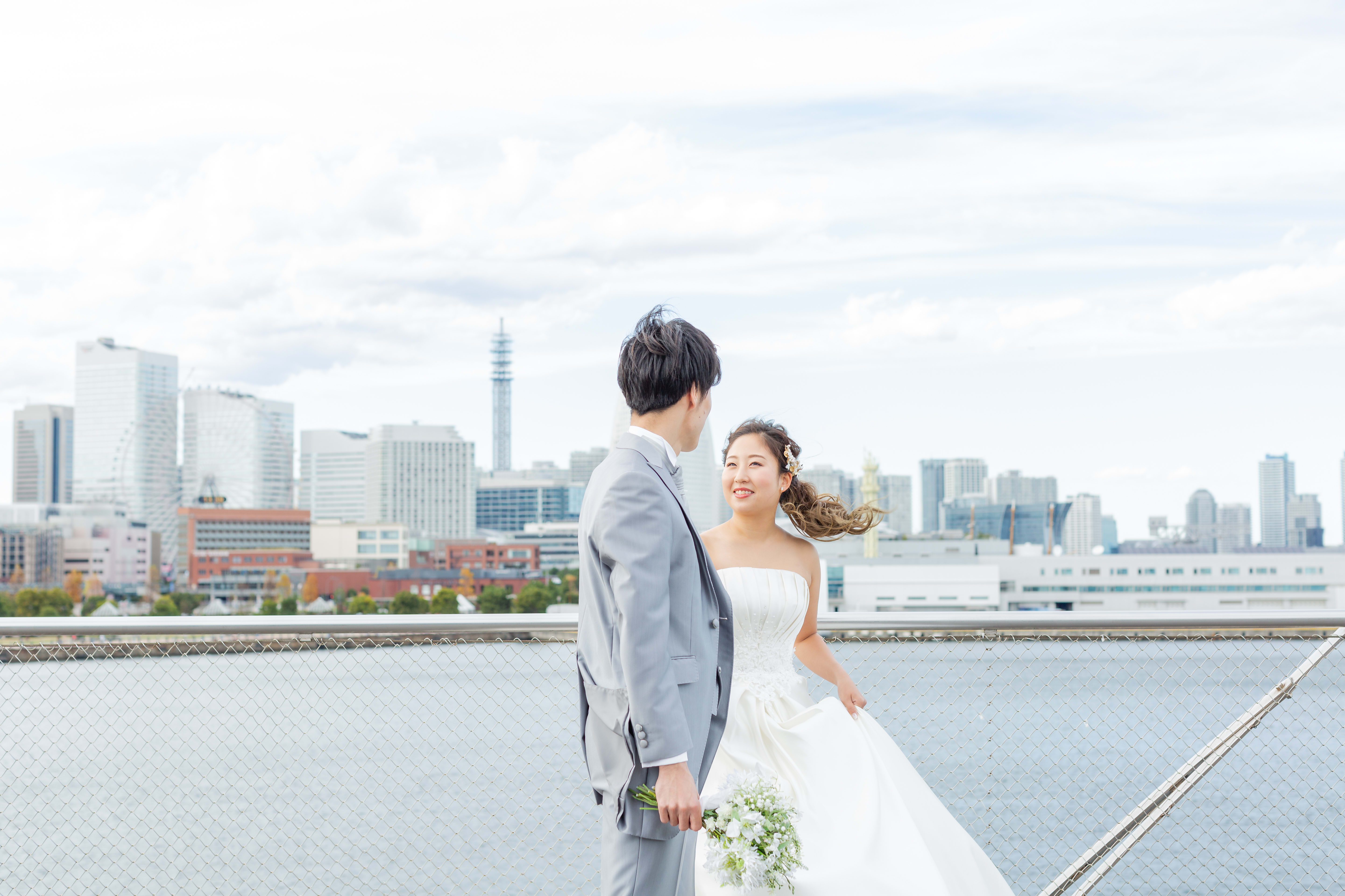 【横浜で記念日】汽笛が二人のスタートを祝う横浜のロケーションで美しい一枚を