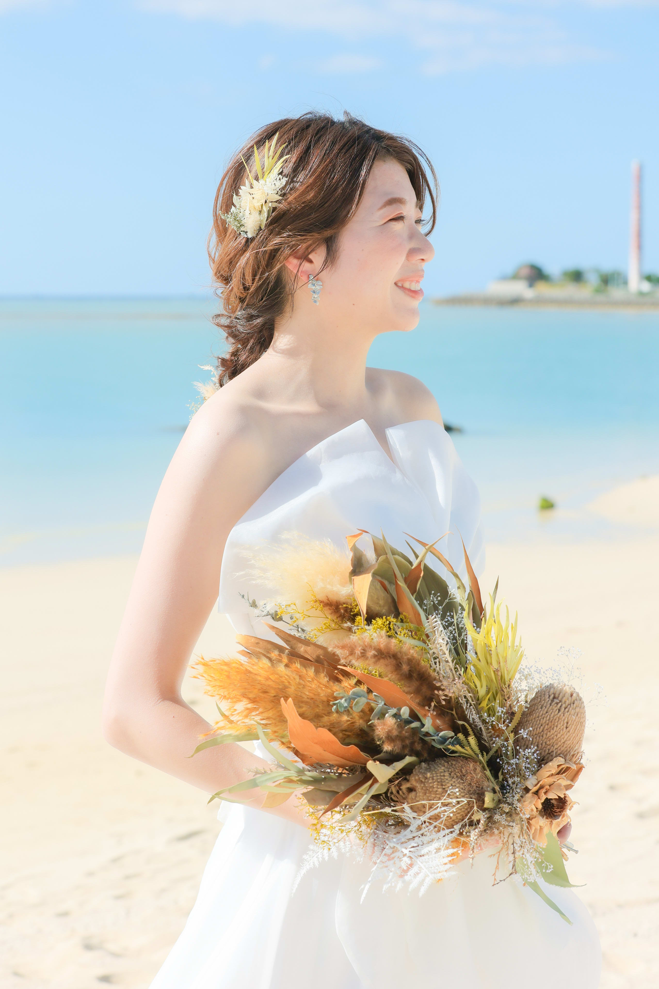 いくつになっても、一生に一度の瞬間を懐かしんでもらいたいから 新婦様に寄り添って、”自分らしさ”を大切にしたご提案を心掛けています🕊️ 衣装合わせから当日まで、楽しい時間を一緒に過ごしていただけたら嬉しいです🙌 美容師として7年の経験を積み、ブライダルの世界に飛び込みたくさんの花嫁さまを担当してきました👰♀️💐 明るく親しみやすい性格なので、どんなことでも気軽にご相談ください。 お二人の特別な思い出のお手伝いができるのを楽しみにしています。 お支度から楽しくリラックスしていきましょ〜 ※生花を使用したアレンジもご相談ください