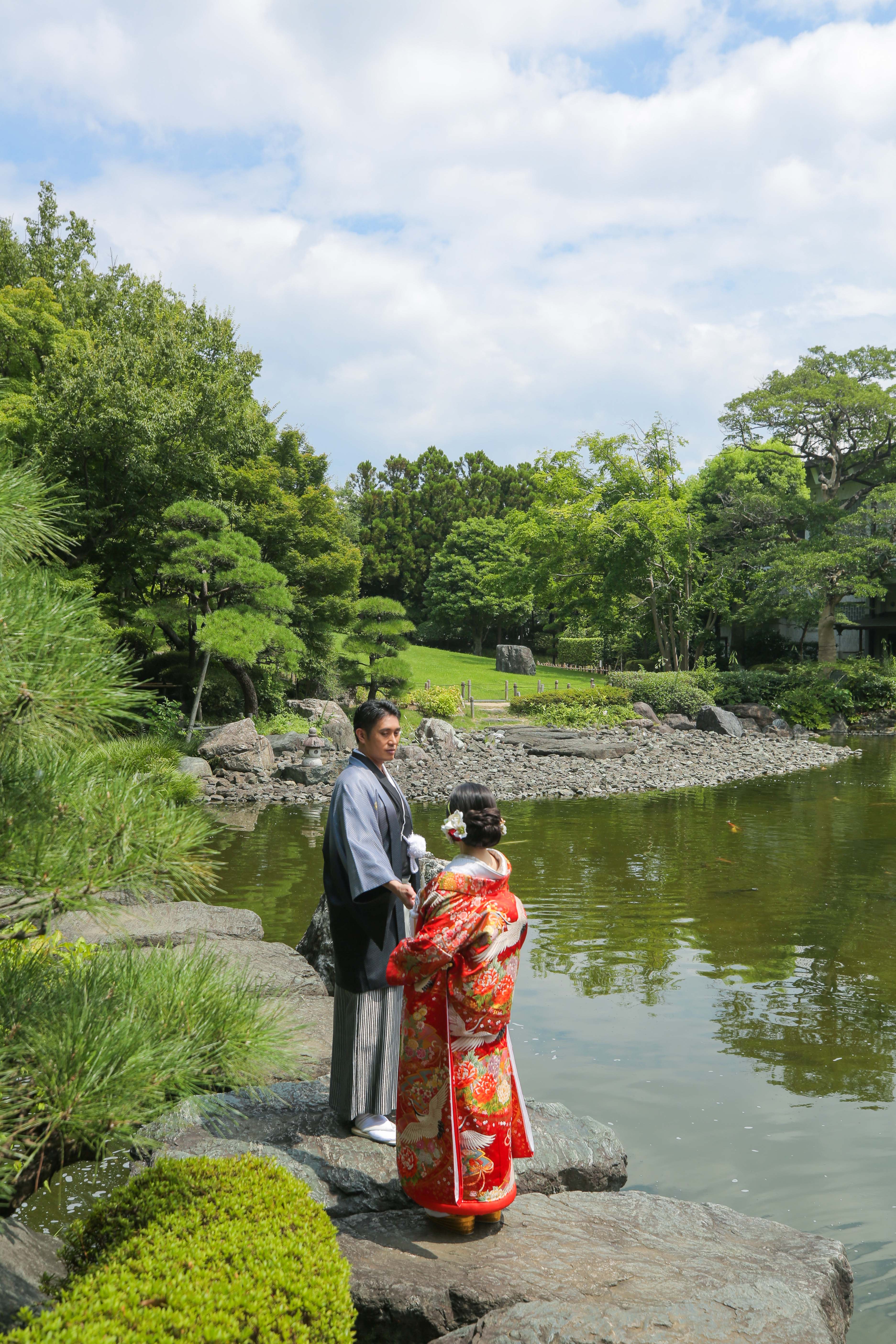 本格日本庭園を再現したスタジオで撮る 和装の結婚写真