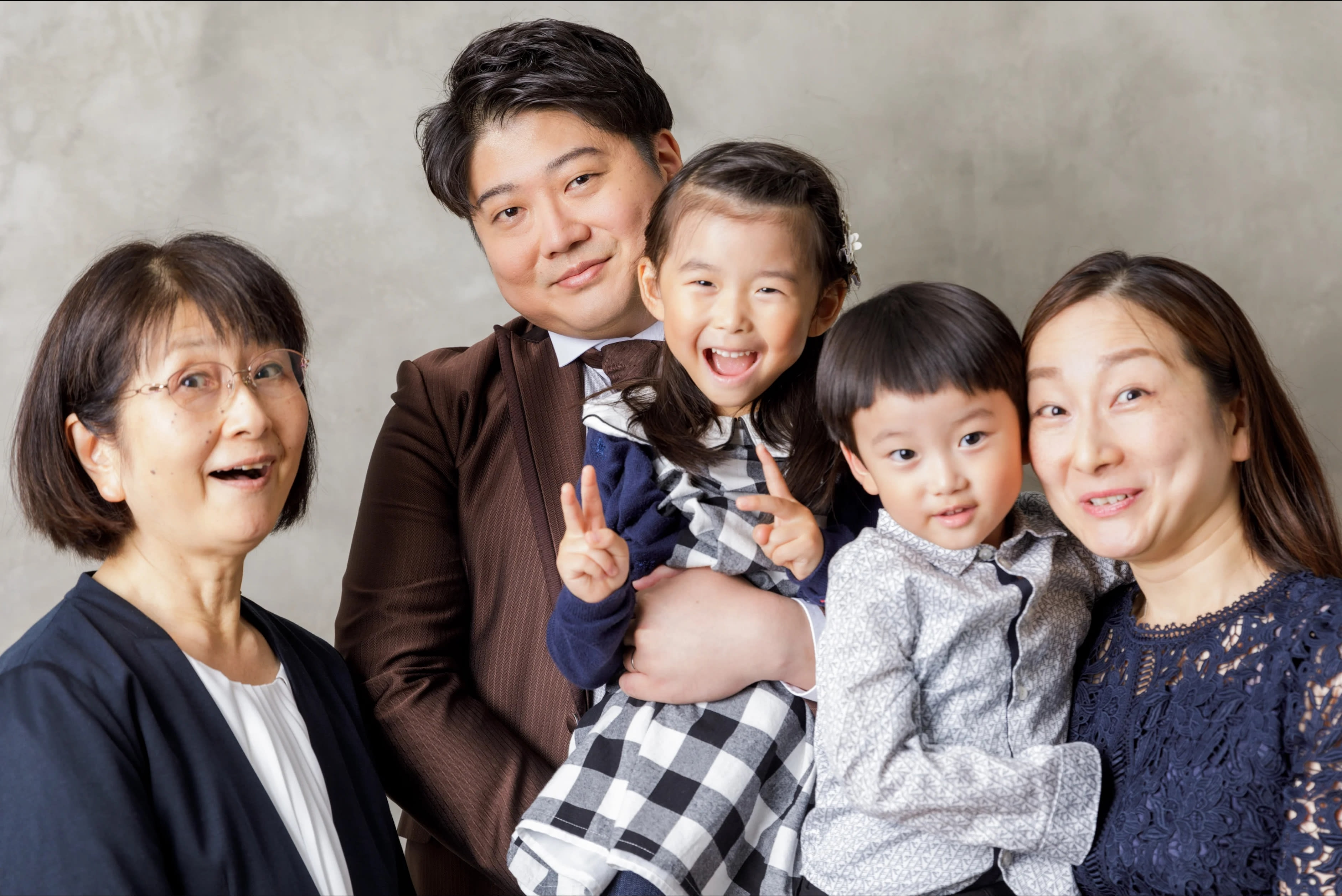 大好きな家族との写真は緊張してじいちゃんよりも渋い顔をしています。