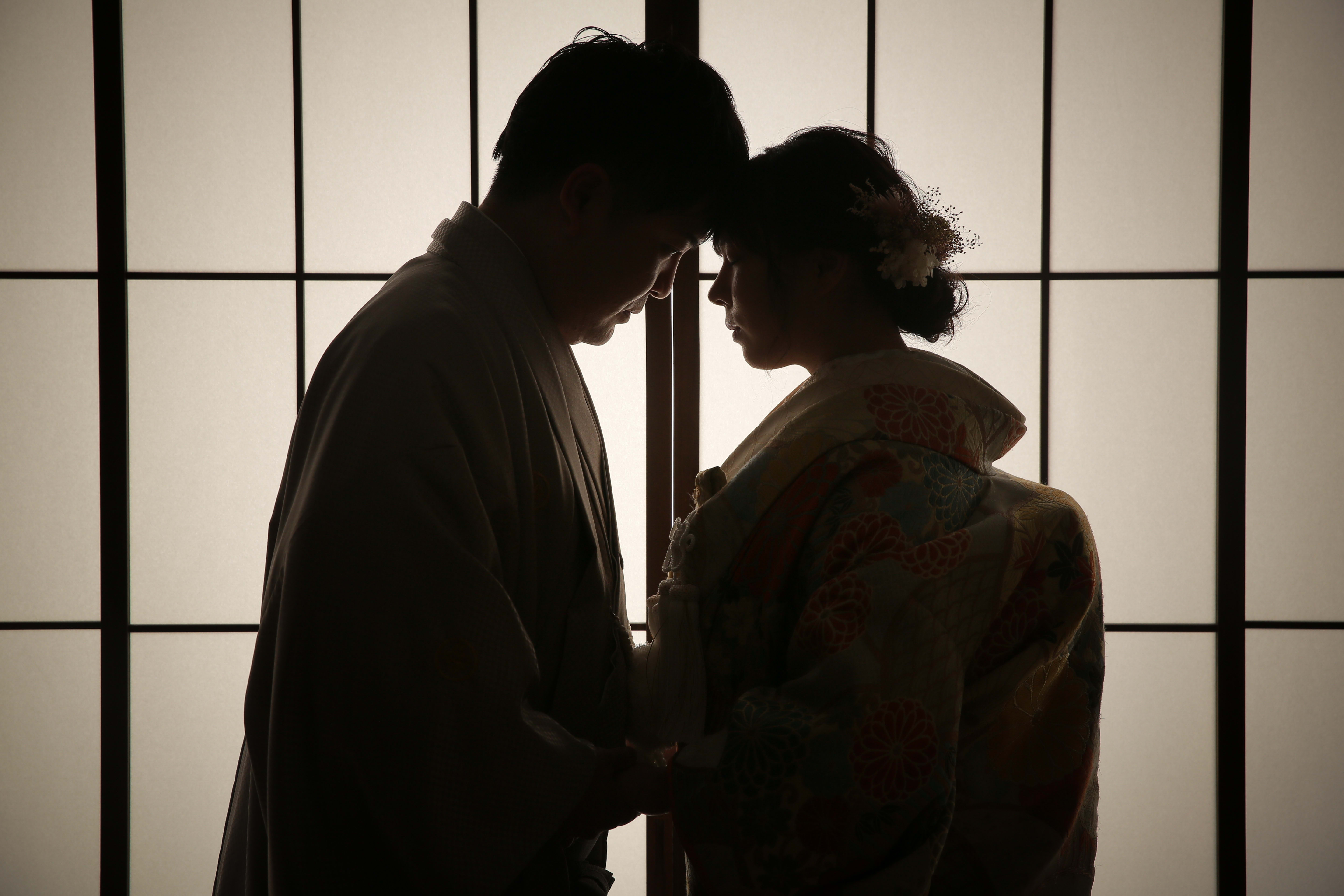 新宿店の本格的な茶室スタジオで撮影する、和装の結婚写真