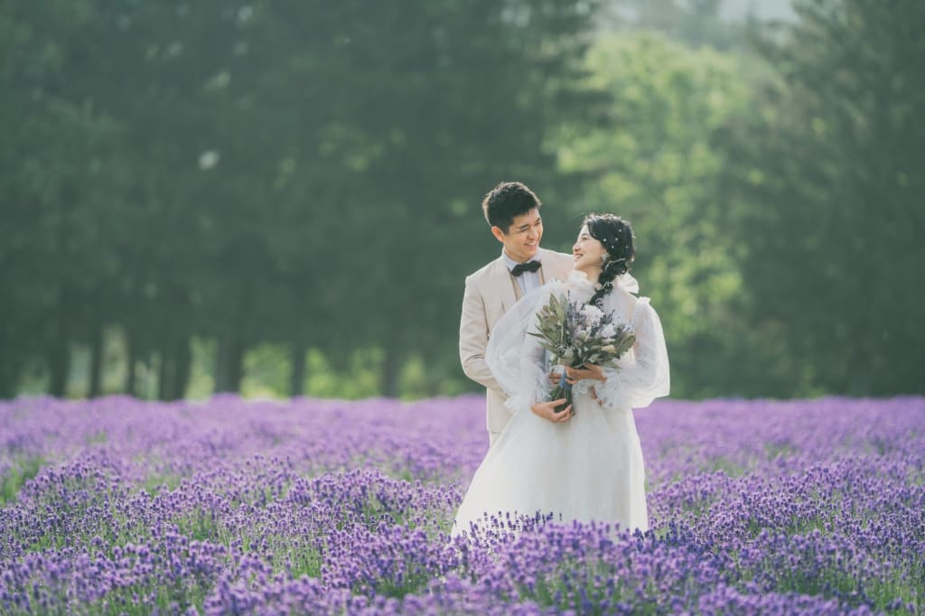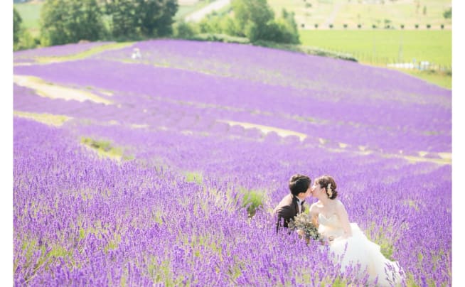 ラベンダー畑や新緑を背景に、華やかなフォトウェディングを叶えられる7月の北海道。