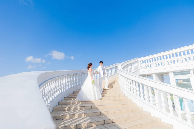 花嫁さんとドレスを美しく撮る方法として人気なのは、階段での1枚。ロングトレーンやロングベールのドレスは特におすすめです。優しくエスコートする花婿さんのポーズも忘れず決めておきましょう。