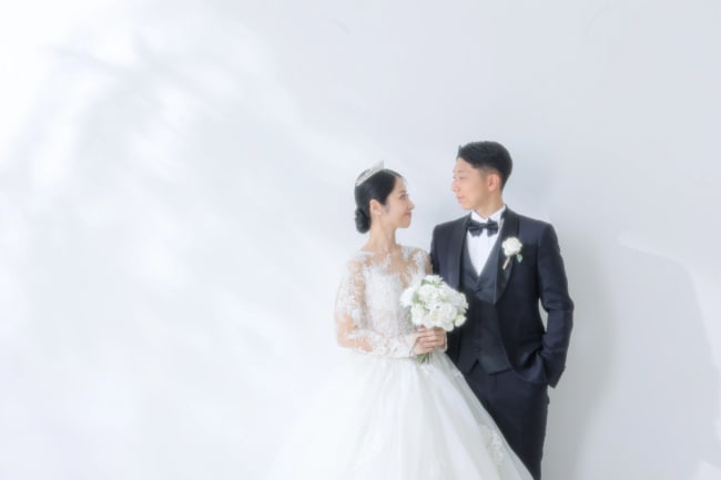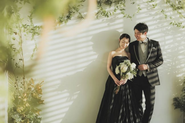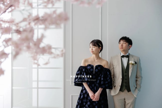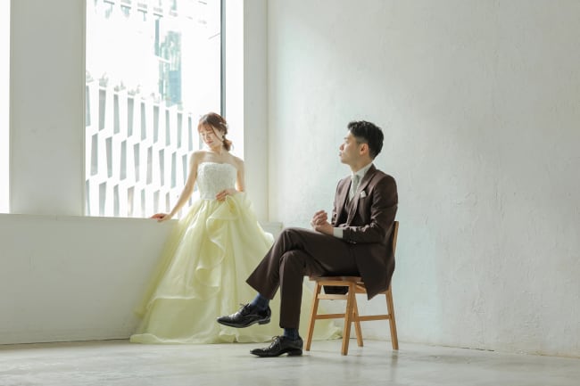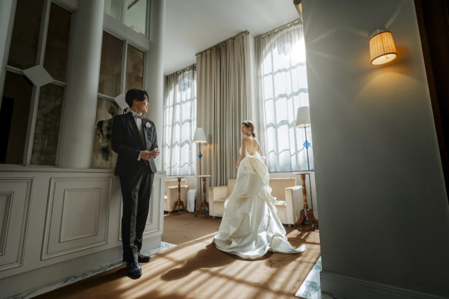 前撮りの衣装選びでは、新郎の衣装デザインも考慮しましょう。2人で並んだときに統一感が生まれるようなコーディネートは、より写真映えしやすくなります。