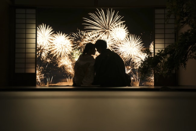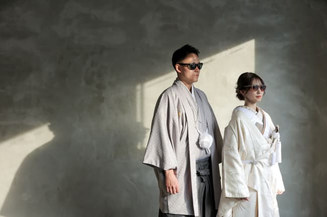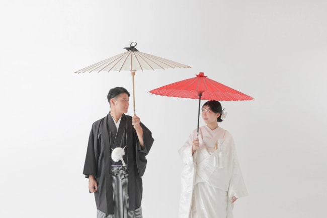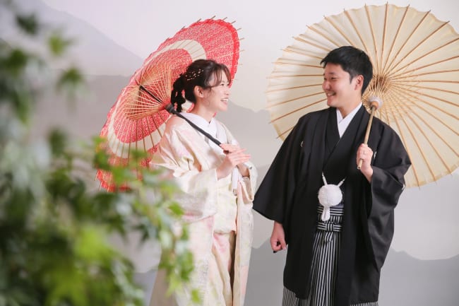 着物を着たふたりが和傘を指して微笑むシーンは大人っぽく、ロマンチックな印象を感じられます。