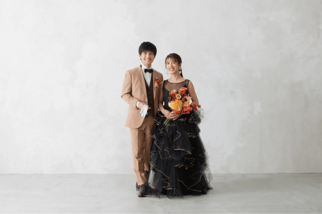 黒色のウェディングドレスは、写真撮影がメインの前撮りやフォトウェディングによく映えます。スタイリッシュで高級感があり、何よりおしゃれなため、スタジオだけでなくロケーション撮影との相性も良好です。