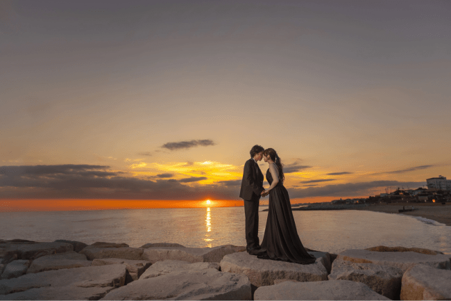 また、サンセットタイムの撮影では、黒のドレスが夕日のなかに浮かび上がってドラマチックな1枚に。崖や海辺を背景にした撮影だと、まるでアート写真に仕上がります。
