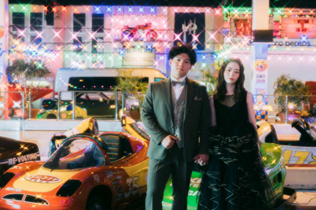 黒色のウェディングドレスは意外にも、にぎやかな遊園地に映えます。遊園地といえば、色とりどりのアトラクションや装飾が豊富です。