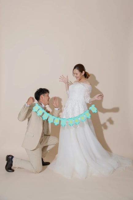 両親や上のお子さまと一緒に撮影することで、お腹だけではなく、家族の絆や幸せな雰囲気を強調することができます。手をつないだり、見つめ合ったり、笑顔で寄り添ったりするポーズは、温かく和やかな印象を与えます。