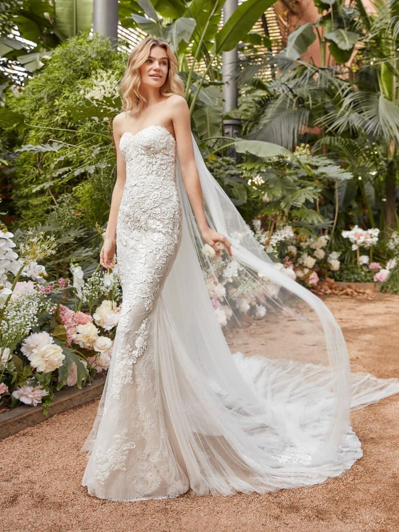 2種類のレースを贅沢にあしらったマーメイドドレス。優しい印象を与えつつも、女性らしさを忘れない華やかなデザインが魅力です。ロングベールとレースとの相性も良く、バージンロードを歩く姿に注目が集まりそう。