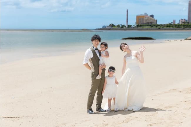 沖縄の美しい景色の中でのフォトウェディングは、ご夫婦にとって大事な記念日を祝う場であると同時に、お子様も含めた家族の仲の良さを記念に残す絶好の機会でもあります。